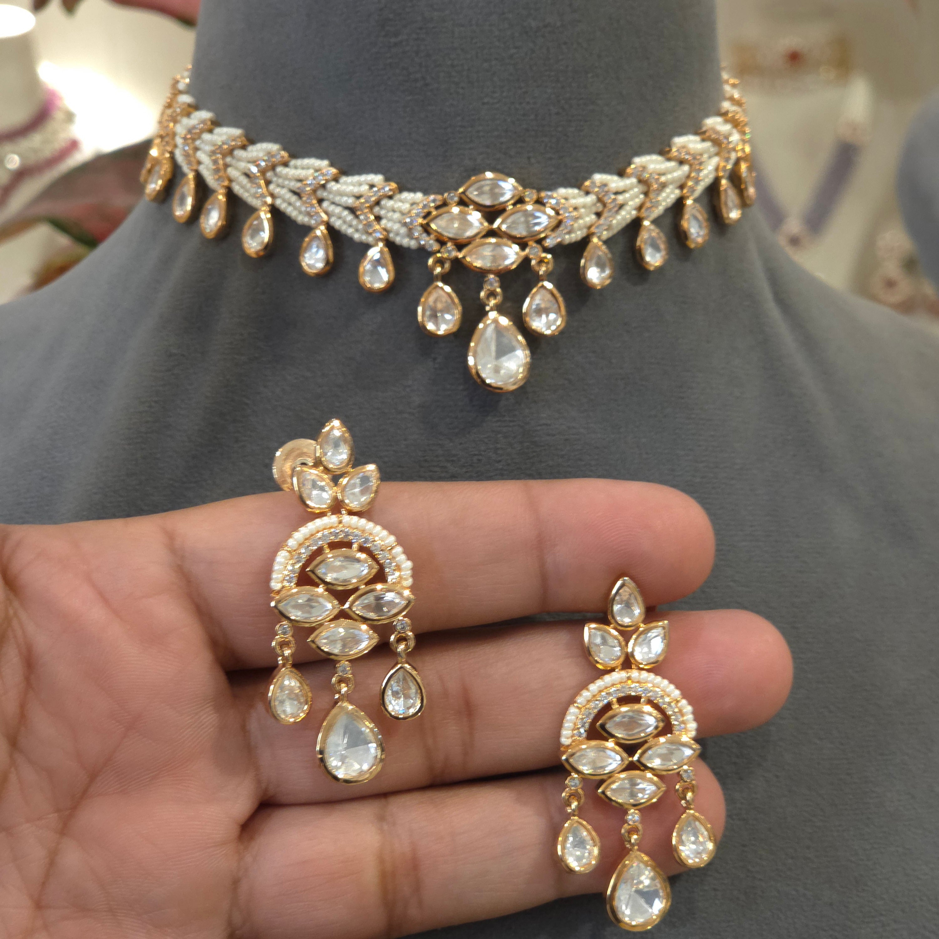 The Sarika polki choker set is crafted from a brass mixed metal alloy, featuring intricate CZ silver foil polki and micro pearl beading. Weighing less than traditional pieces, it offers both elegance and comfort. The 18 kt gold plating enhances durability while providing a chic accessory for contemporary attire.