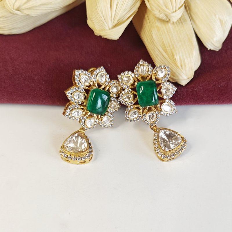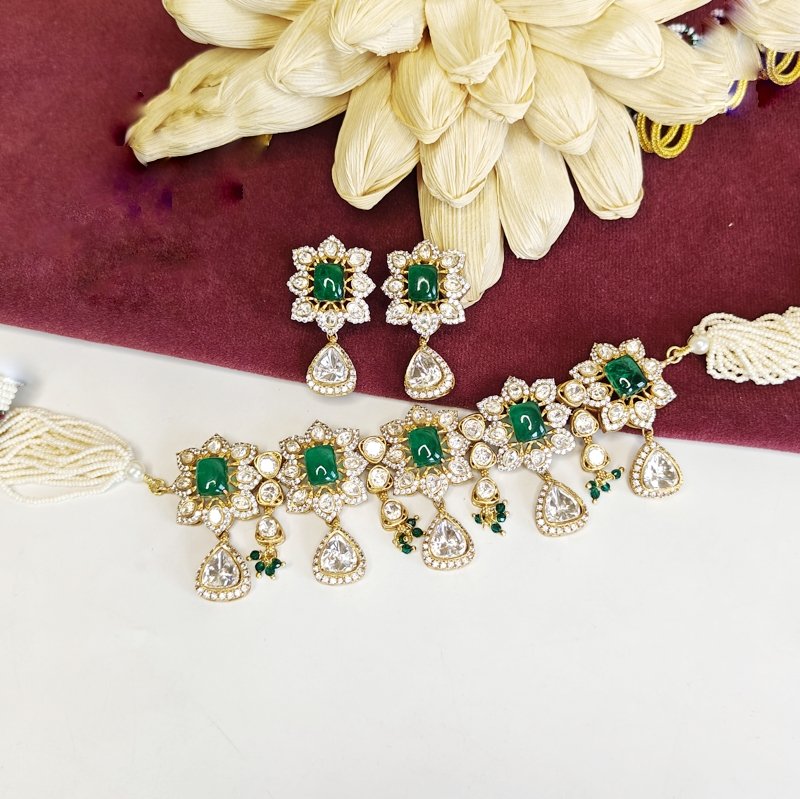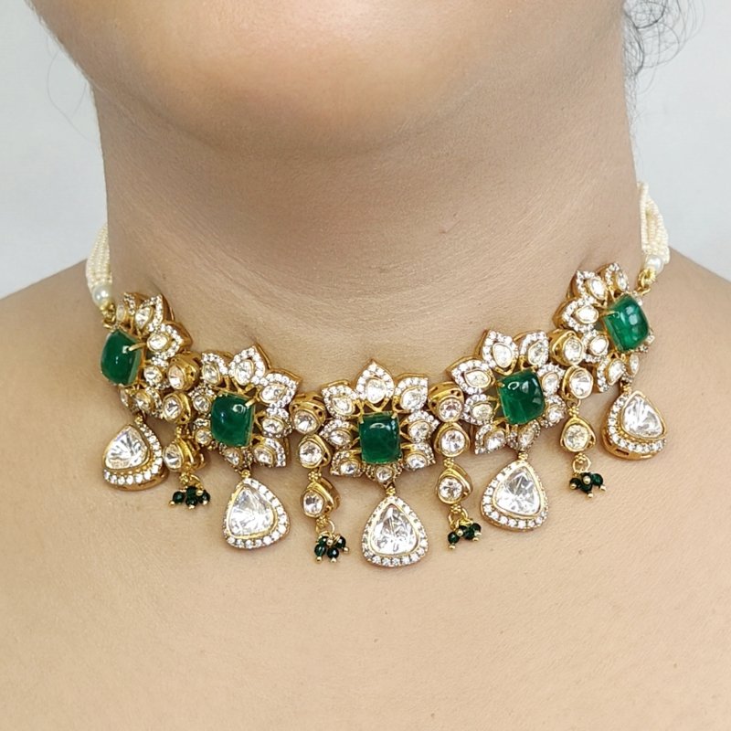 This lightweight gold-plated choker set is studded with emerald green doublet stone along with shimmering golden Moissanite polki, surrounded by sparkling CZ stones. Its delicate design makes it a beautiful and versatile piece, perfect for adding elegance to any occasion while offering both comfort and style.
