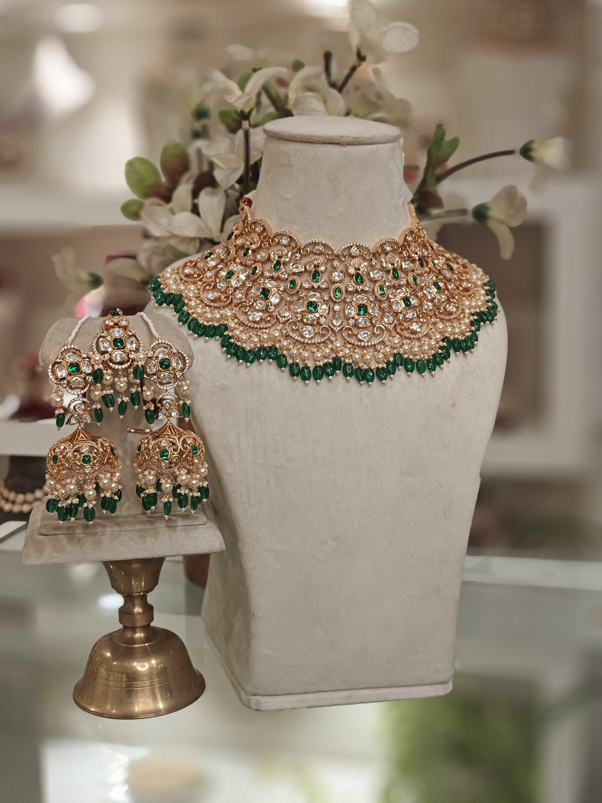 This astonishing bridal choker set is crafted using emerald green hydro stones adorned with polki and cz stones, all complemented by small pearls and emerald green stone beading. The set also includes beautiful long jhumkas with sahara, making it an essential addition to any bride’s collection.