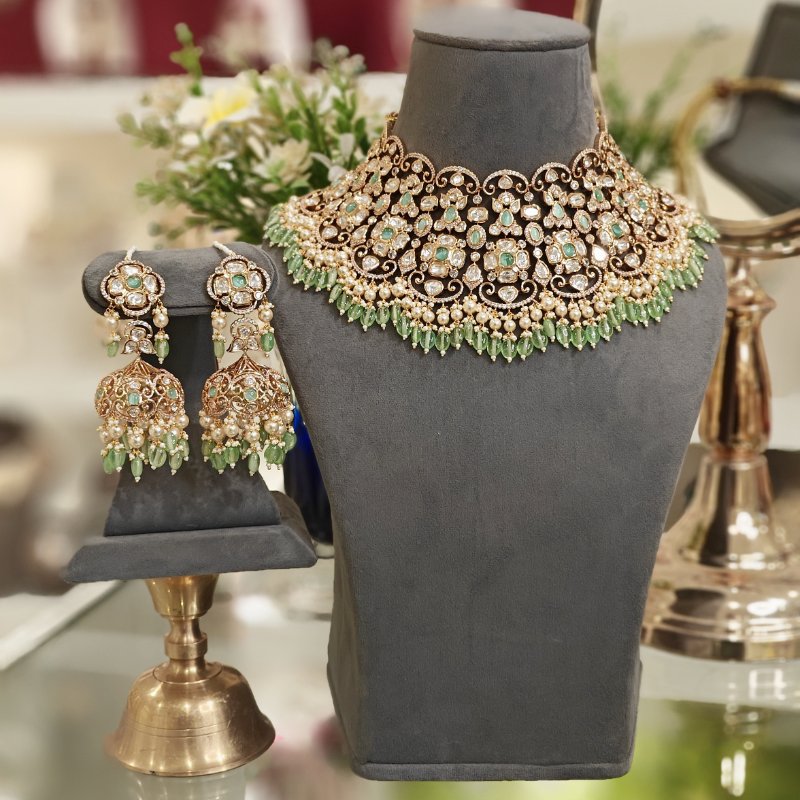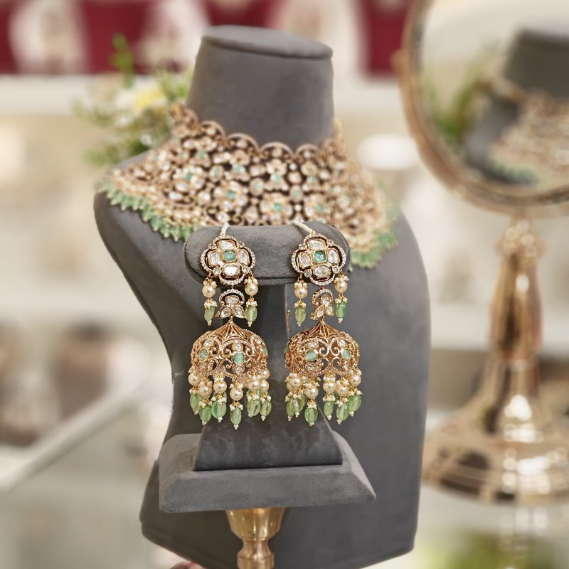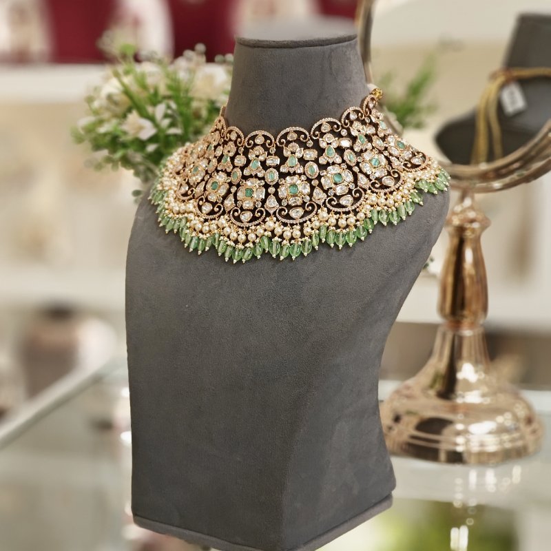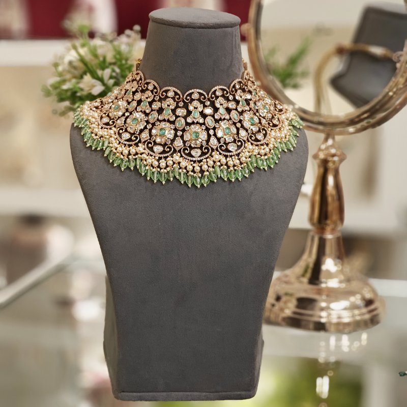 This astonishing bridal choker set is crafted using mint green hydro stones adorned with polki and cz stones, all complemented by small pearls and mint green monalisa beading. The set also includes beautiful long jhumkas with sahara, making it an essential addition to any bride's collection.