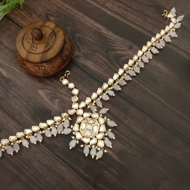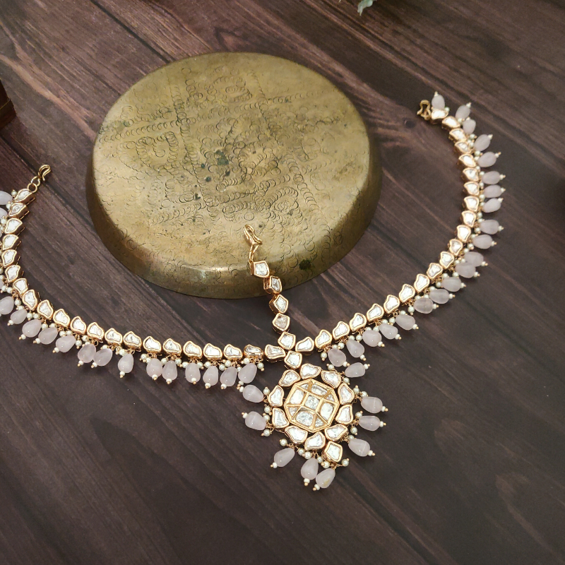 Sheeshpatti that boasts artificial polki embellishments. The piece includes a stunning maagtikka and is adorned with baby pink drops , all finished off with an 18 kt gold plating.