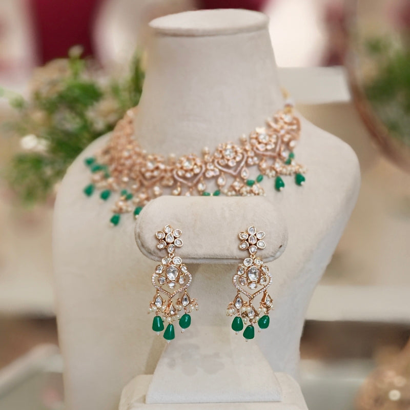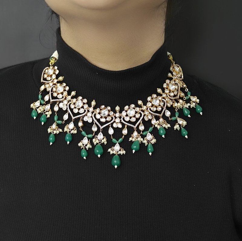 The Sharmila neckline set is meticulously crafted using the finest uncut artificial polki , which is then plated with a luxurious 18 kt gold hue to add more charm to it. To create this ornate piece of beauty even more special, the necklace is integrated with beautiful emerald green colour stones that are arranged in a beaded fashion. This necklace can be customized in any colour of your choice .