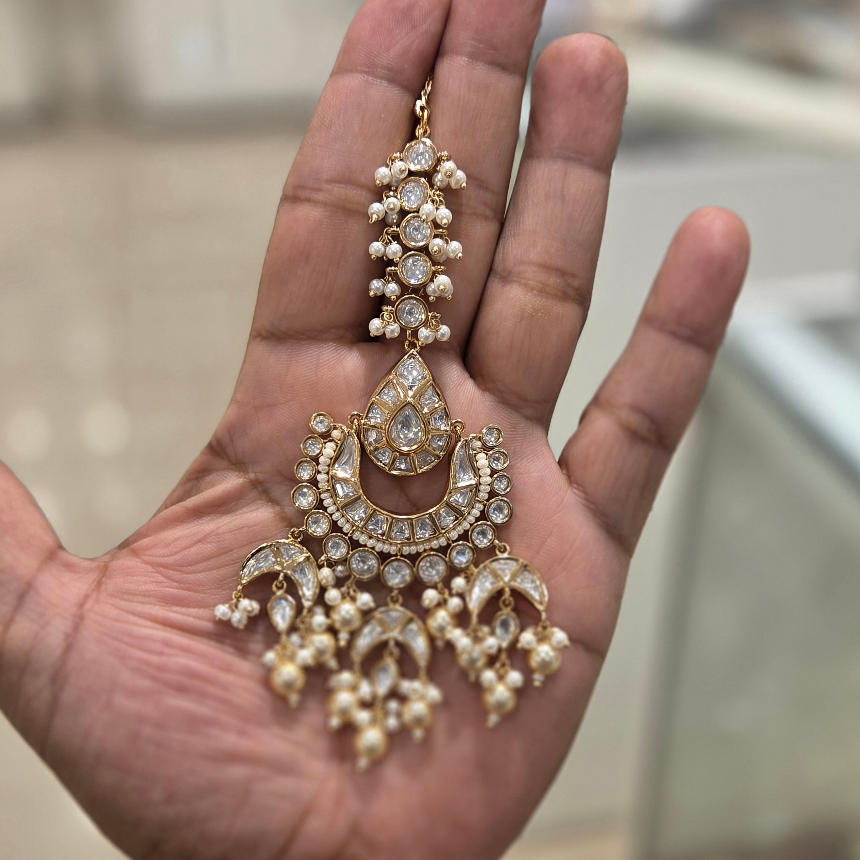 Medium sized beautiful maangtikka made with cz uncut polki and plated with 18 kt gold plated beaded with small pearls
