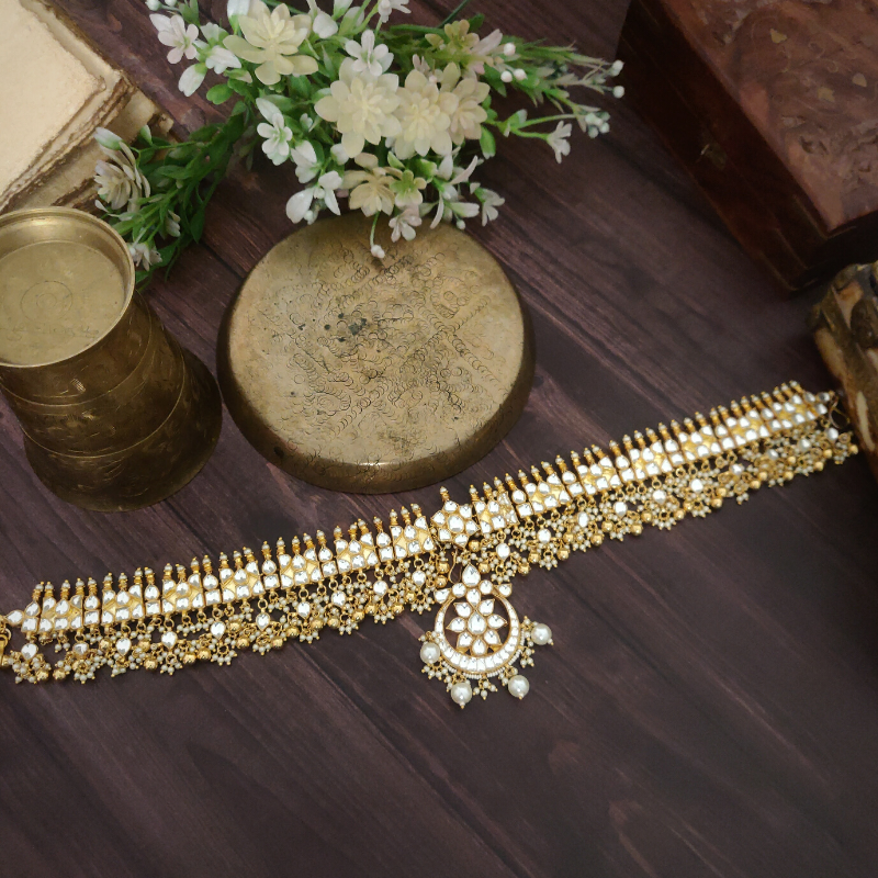 An exquisite mathapatti with a 22 kt gold plating is created in paachi kundan work with widest patti design . Adorned with pearls and golden balls , this stunning piece is sure to make a statement.