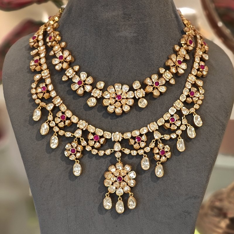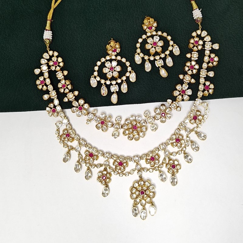 This stunning necklace set is a true masterpiece, featuring Moissanite polki with ruby red stones in double line design . The design is complemented by intricate silver daak elements and plated with luxurious 22K gold, offering a captivating and elegant finish. Perfect for those seeking a blend of sophistication and timeless beauty.