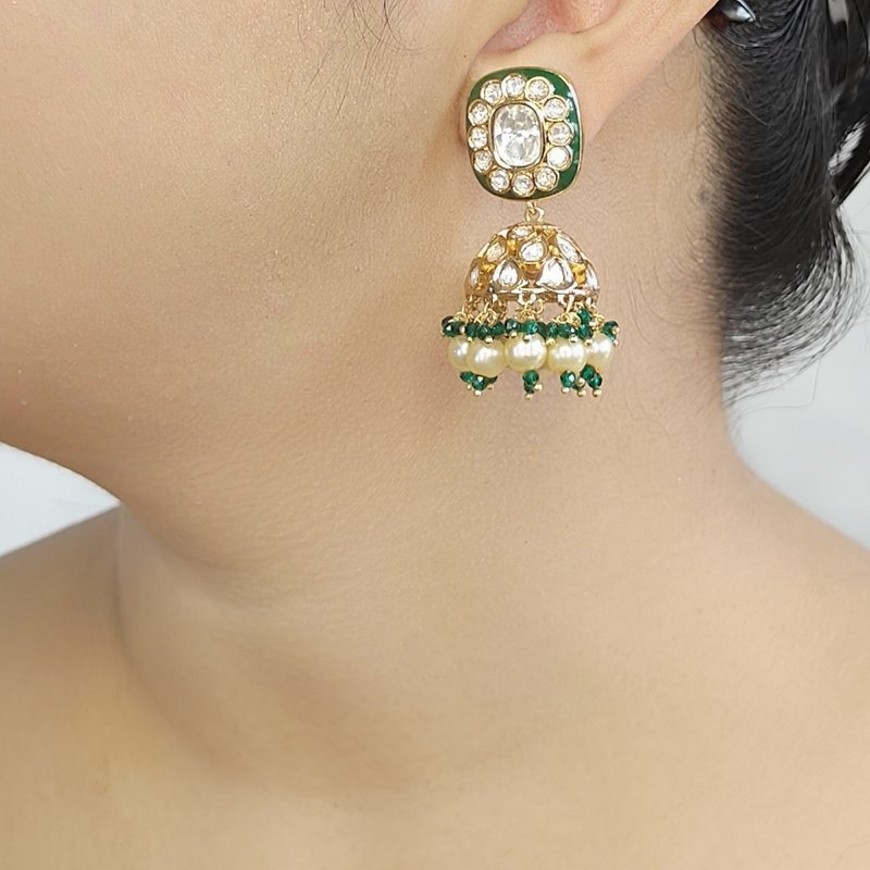These elegant jhumkas are crafted with uncut CZ Polki stones and beautifully beaded with emerald green coloured beads with pearls . Plated in 18 kt gold colour, they combine traditional craftsmanship with a touch of modern flair, perfect for adding a regal finish to any look.