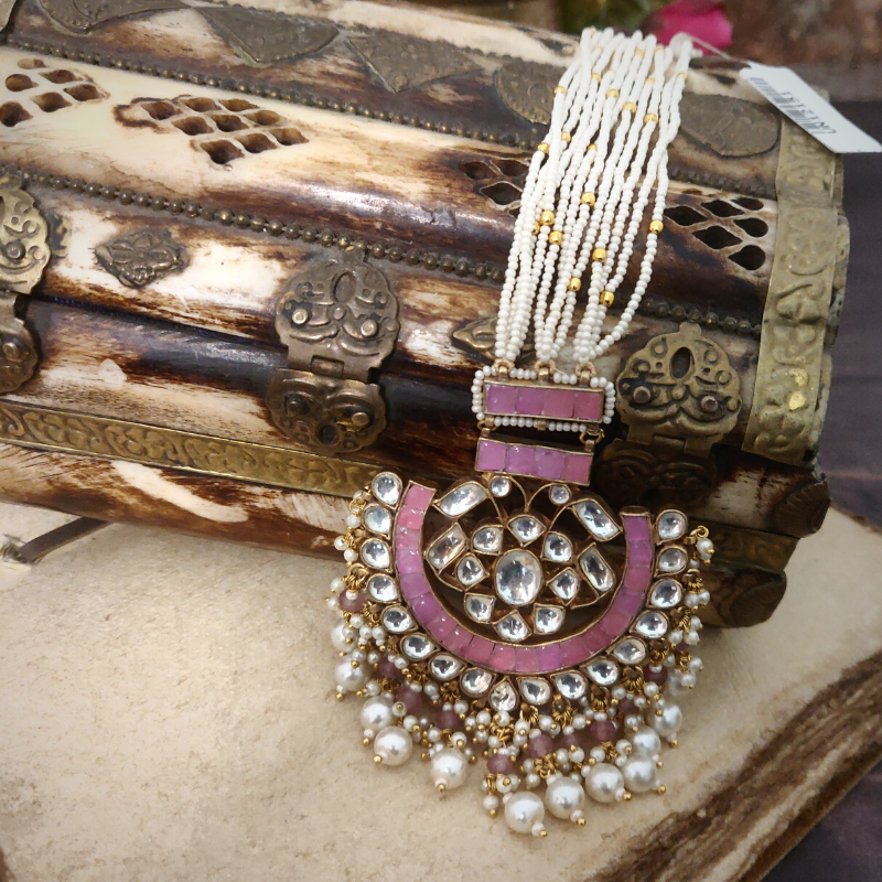 22 kt gold plated chaand style maangtikka made in white and pink Ahmedabadi paachi kundan and ,beaded with white pearls ,This embellishment is perfect for any traditional outfit and it adds sophistication to your overall persona.