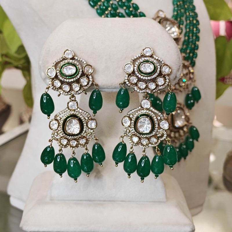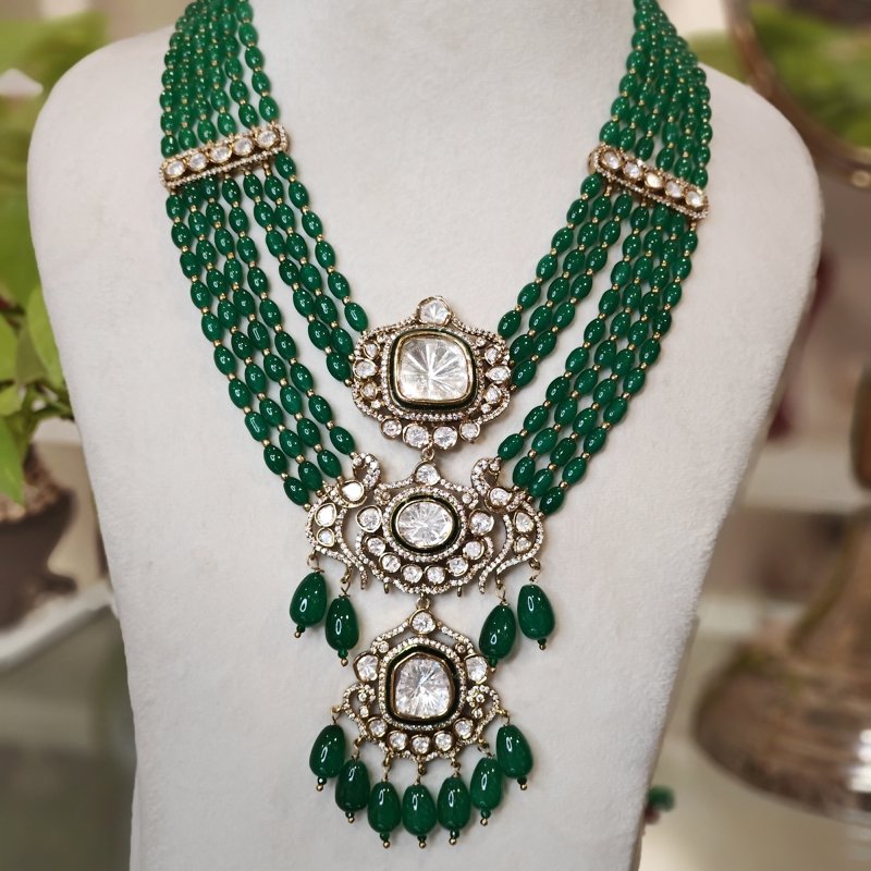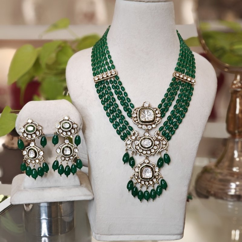 A long pendant necklace set featuring large Polki gems, adorned with emerald green meena and green beads , to give luxurious shine it is plates in 10 micron gold plating
