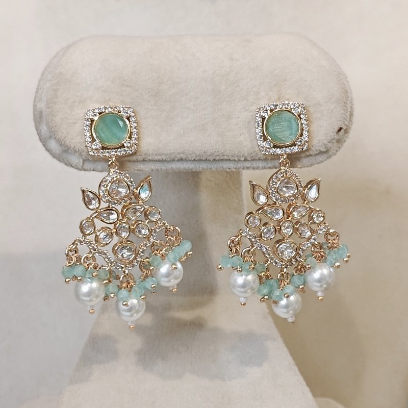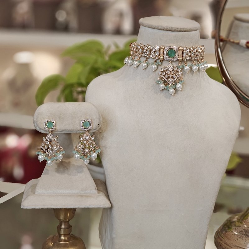 This stunning uncut Polki choker set is elegantly paired with matching earrings beaded with pearls and mint green hydro stones . The pieces are beautifully studded ucut polki stones and sparkling cubic zirconia (CZ), creating a perfect blend of traditional and contemporary charm.