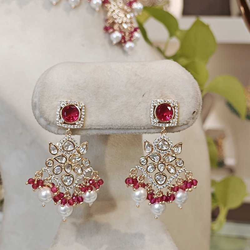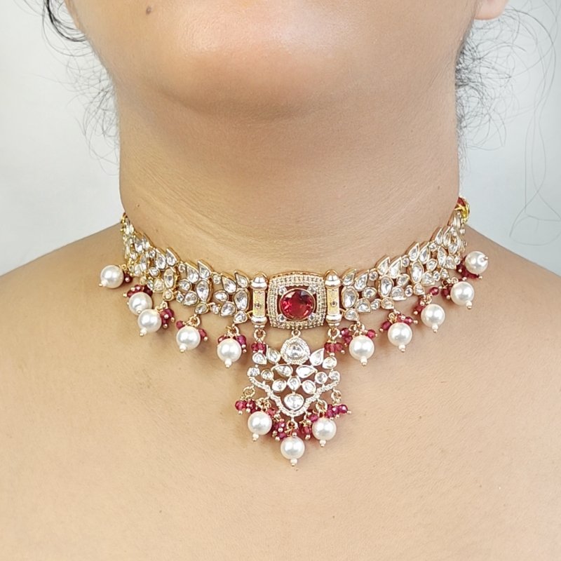 This stunning uncut Polki choker set is elegantly paired with matching earrings beaded with pearls and ruby red hydro stones . The pieces are beautifully studded ucut polki stones and sparkling cubic zirconia (CZ), creating a perfect blend of traditional and contemporary charm.