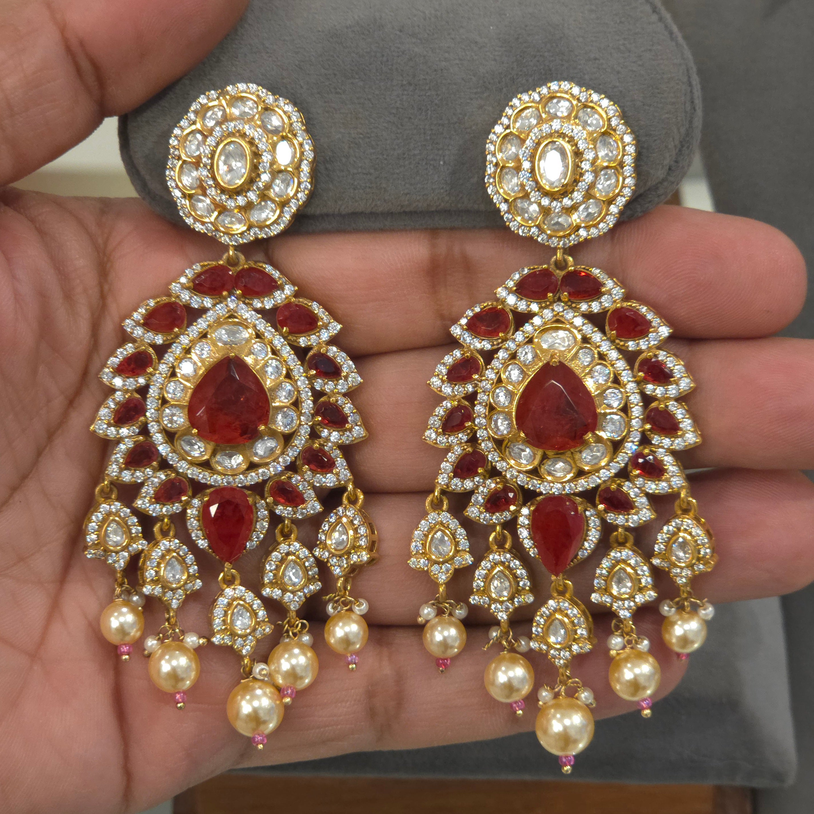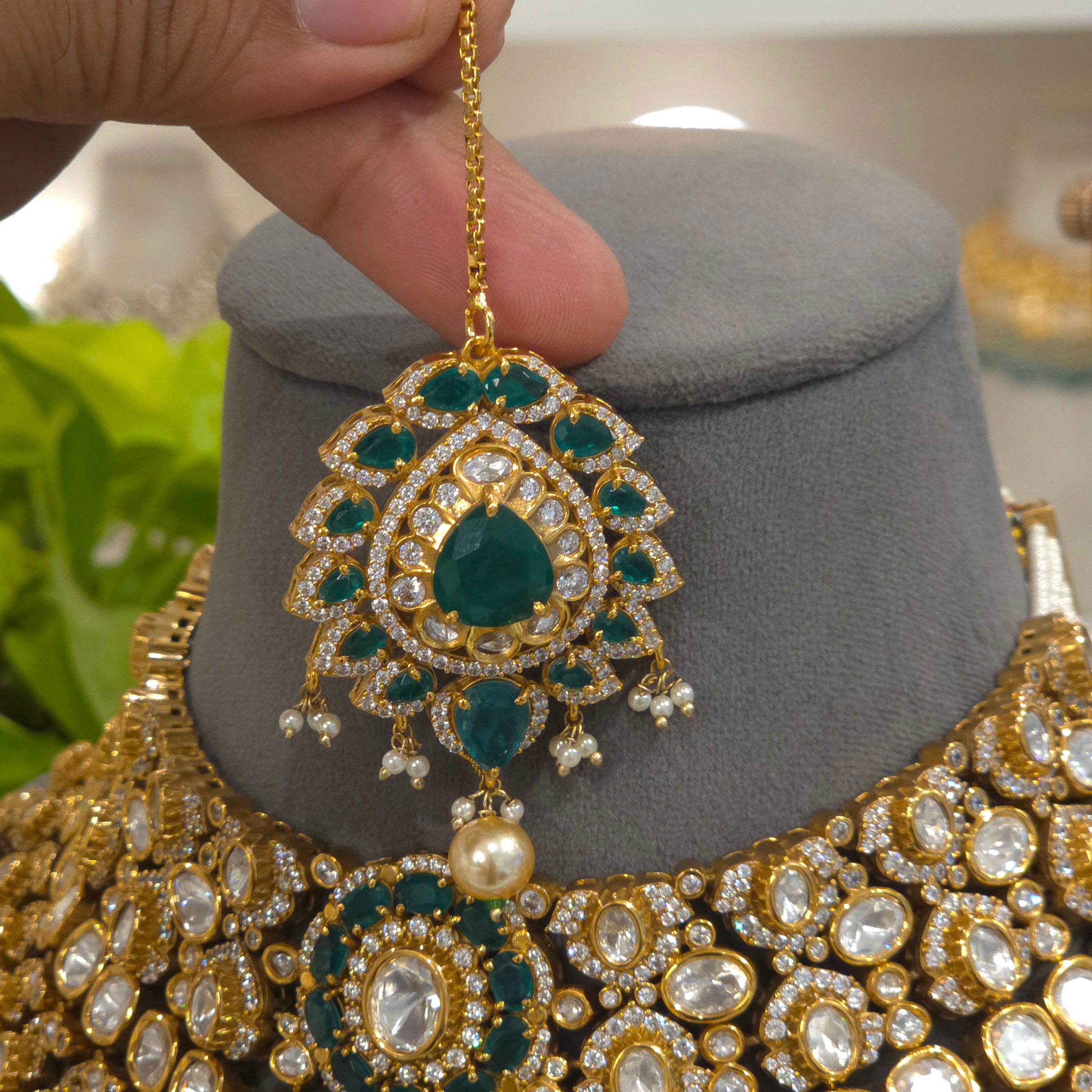Experience the ultimate in bridal jewelry with our Smitha polki necklace set. Adorned with lustrous emerald green amd ruby red doublets and uncut cz silver foil polki stones, accented with delicate rose-tinted pearls, and expertly crafted in mixed metal alloy with a 22 kt matt gold polish. A stunning choice for any bride-to-be.