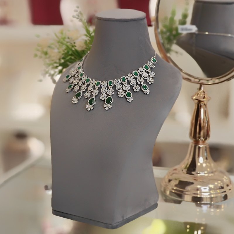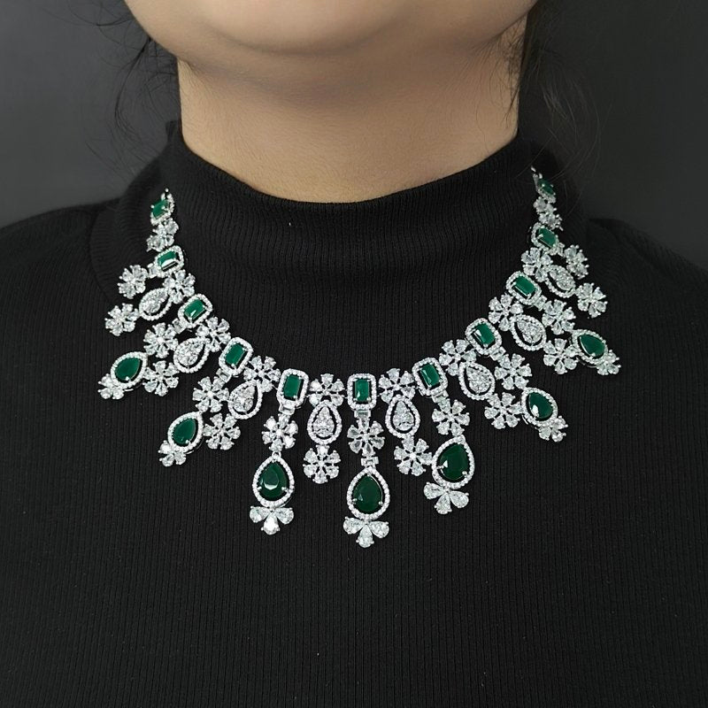 A stunning set featuring an Indo-Western neckline and long dangling earrings crafted with CZ and emerald green stones, all coated in sleek white rhodium plating.