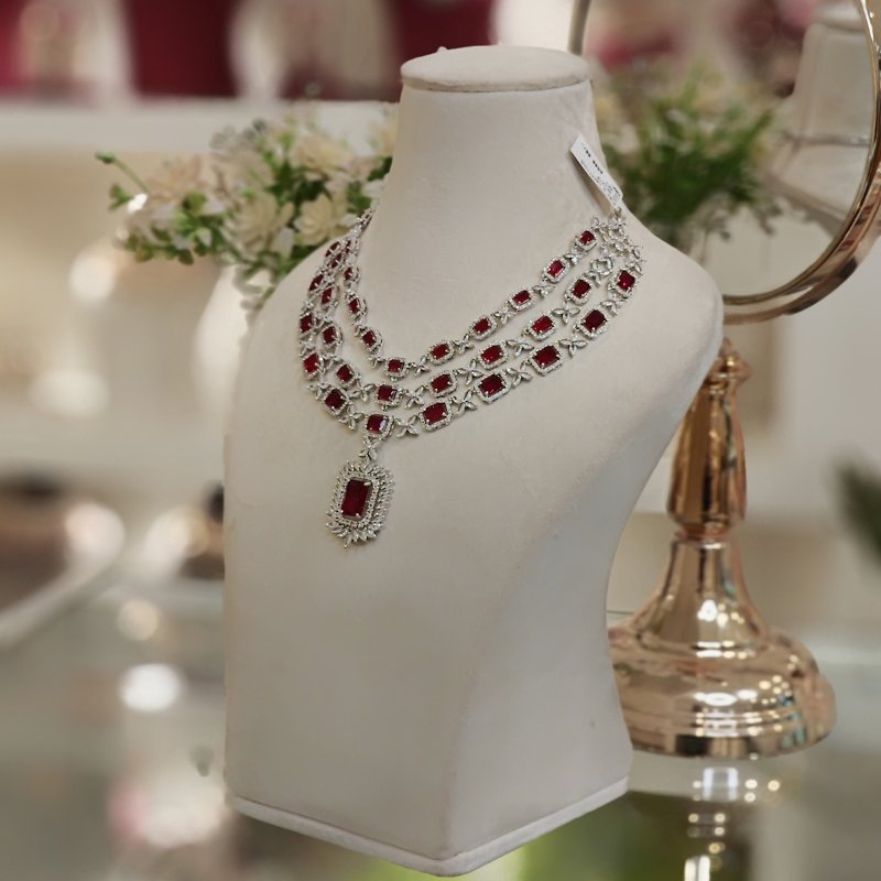 A stunning three line set featuring an Indo-Western neckline and long dangling earrings crafted with CZ and vibrant emerald green coloured stones, all coated in sleek white rhodium plating.
