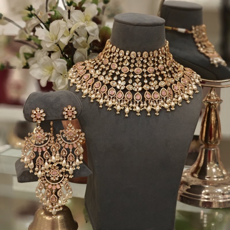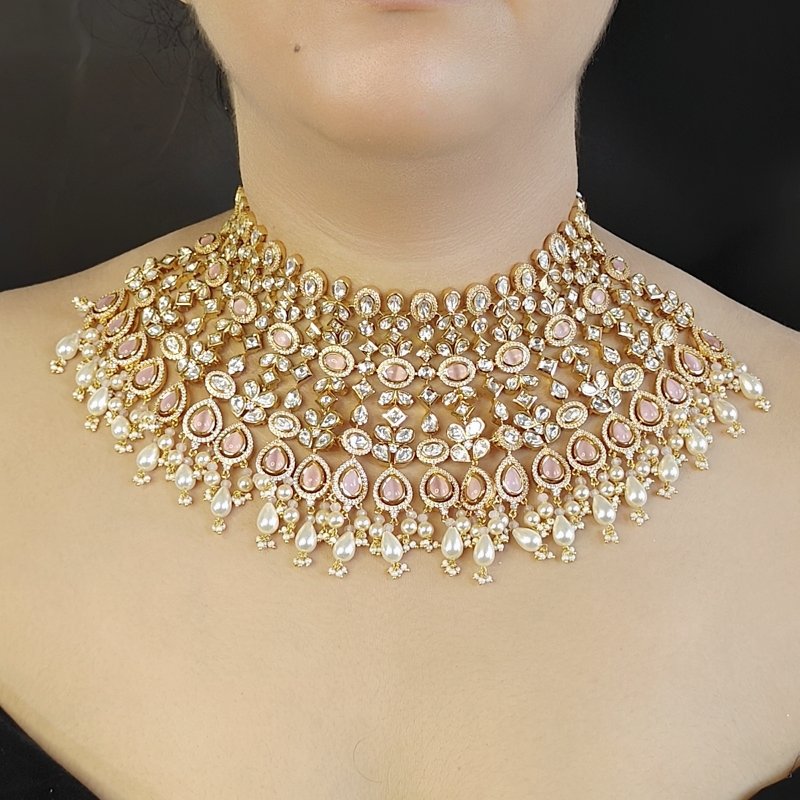 This astonishing bridal choker set is crafted using baby pink monalisa stones adorned with polki and cz stones, all complemented by small pearls . The set also includes beautiful long earrings with tikka , making it an essential addition to any bride's collection.