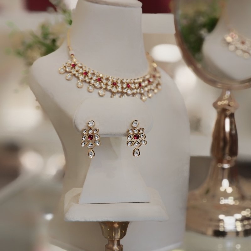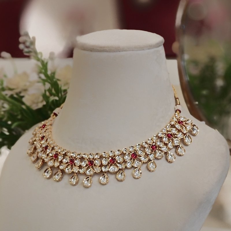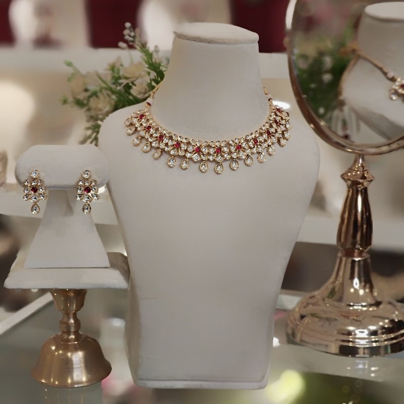Crafted with elegant and light weight design adorned with artificial polkies, this exquisite neckline set shines in stunning 22kt gold plating, completed with stunning stud detailing.