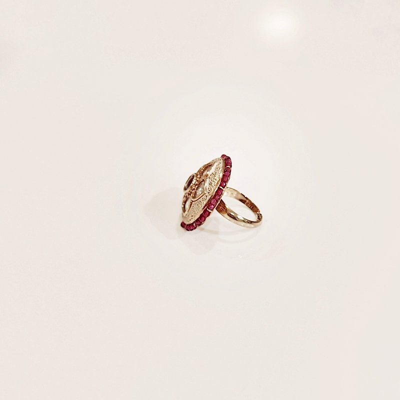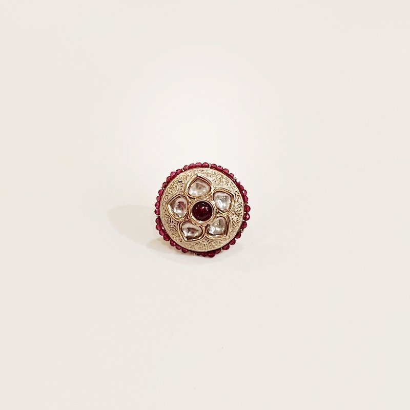 Tarana Polki Ring is ivory enameled and made with Artificial polki, studded with ruby stone & plated in18 kt gold colour .