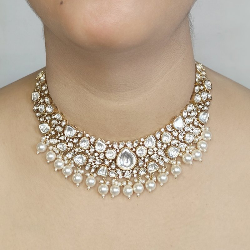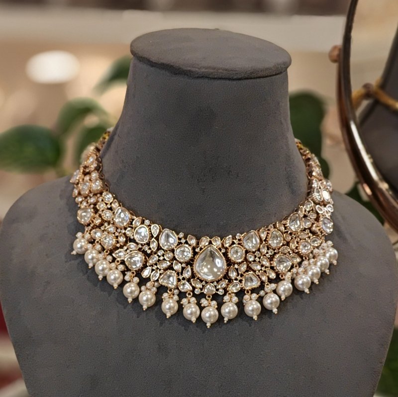 This exquisite bridal necklace set is a true masterpiece, studded with uncut CZ Polki stones and sparkling cubic zirconia. Beaded finely with pearls, it exudes timeless elegance and luxury, making it the perfect choice for brides seeking a blend of traditional charm and contemporary brilliance.
