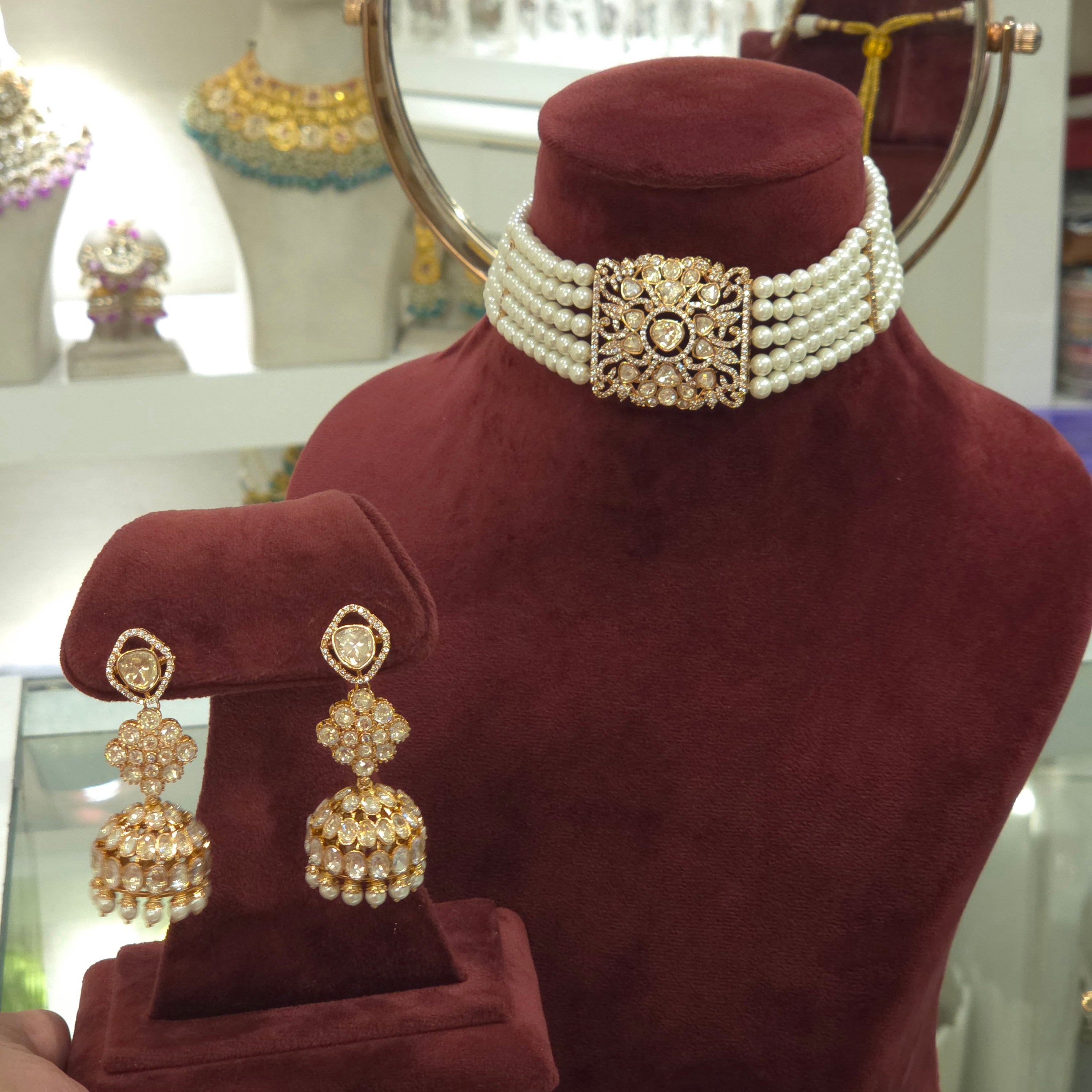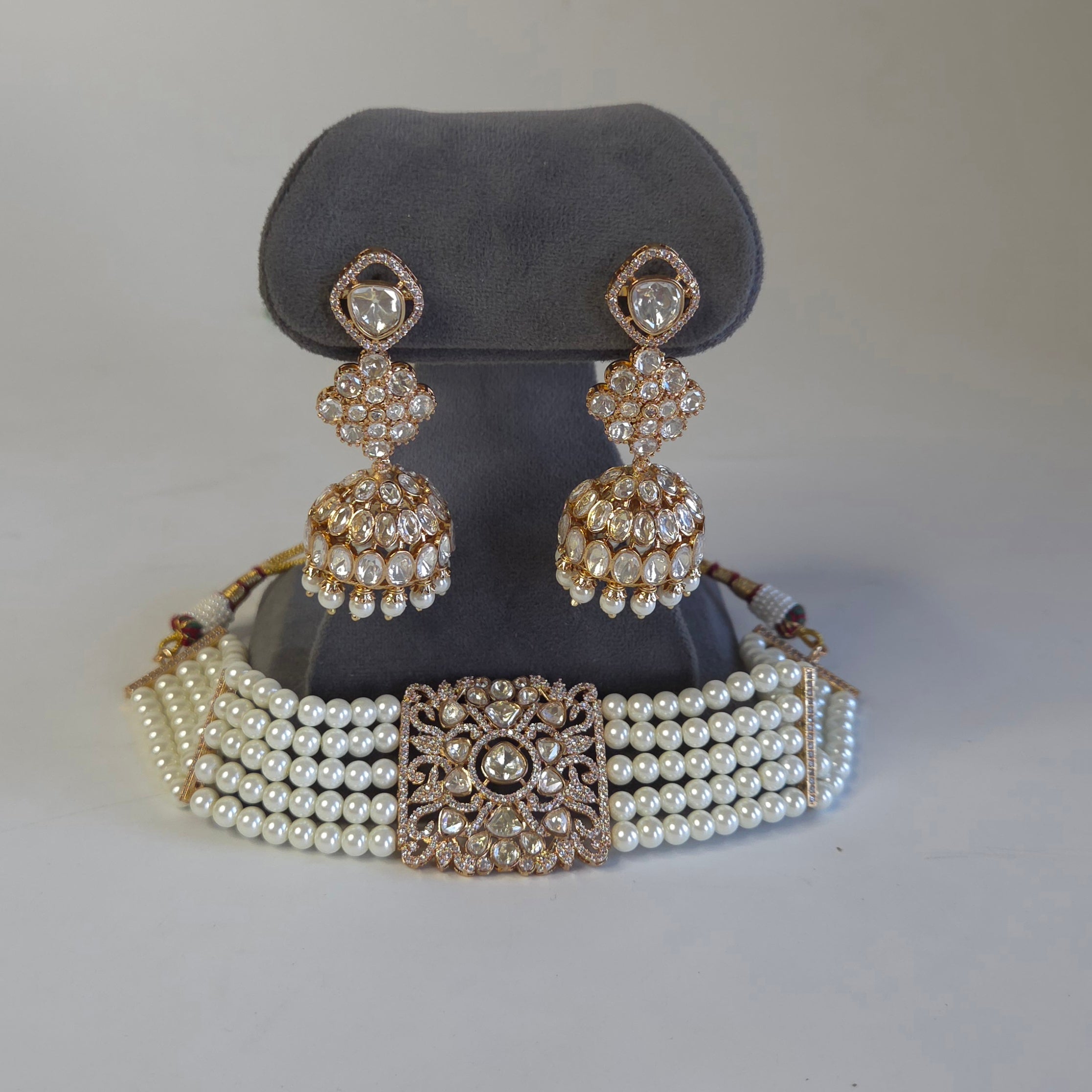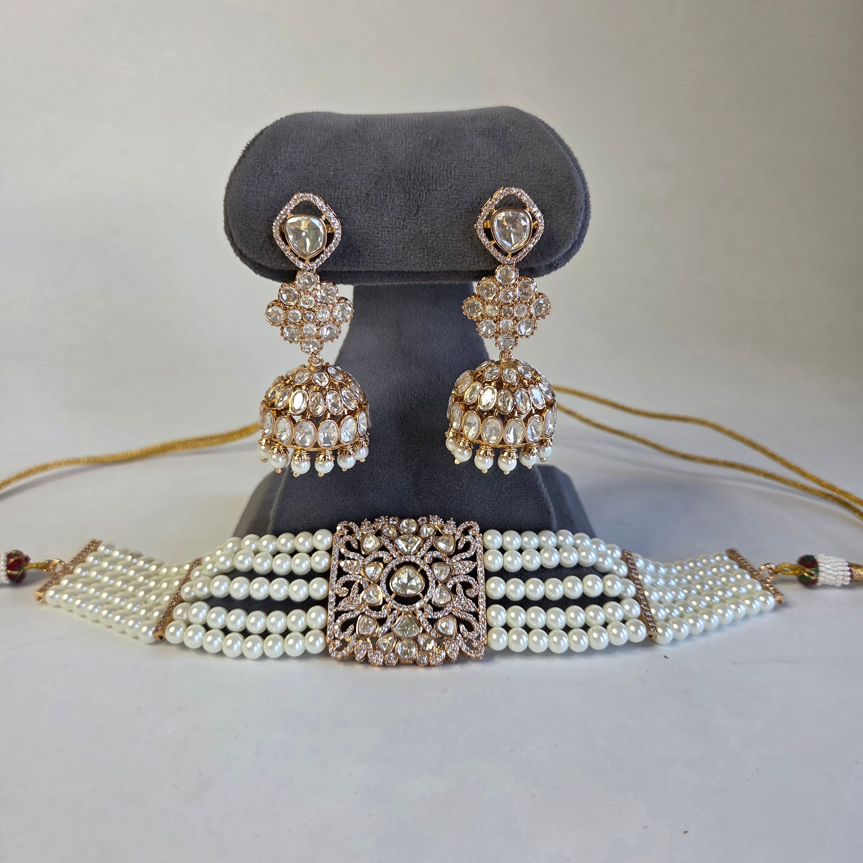 The exquisite choker, adorned with lustrous pearls and a warm rose gold plating, offers a touch of timeless elegance. Delicate moissanite polki stones are meticulously set, catching the light with every movement. The accompanying jhumkas perfectly complement the choker, creating a harmonious and sophisticated ensemble. This set is a beautiful testament to fine craftsmanship done in mixed metal alloy . It promises to add a captivating allure to any occasion.