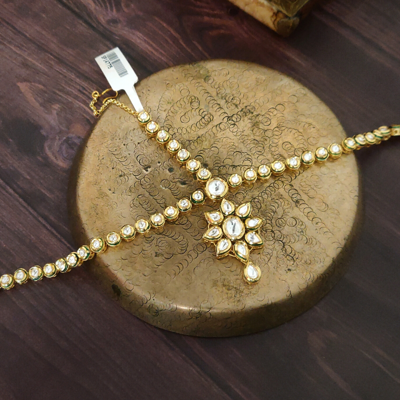 Plated in 22 karat gold, this Mathapatti flaunts a chequered design with pearls and polki stones. The Mathapatti is feather-light and easy to wear, perfect for a stunning bridal look.