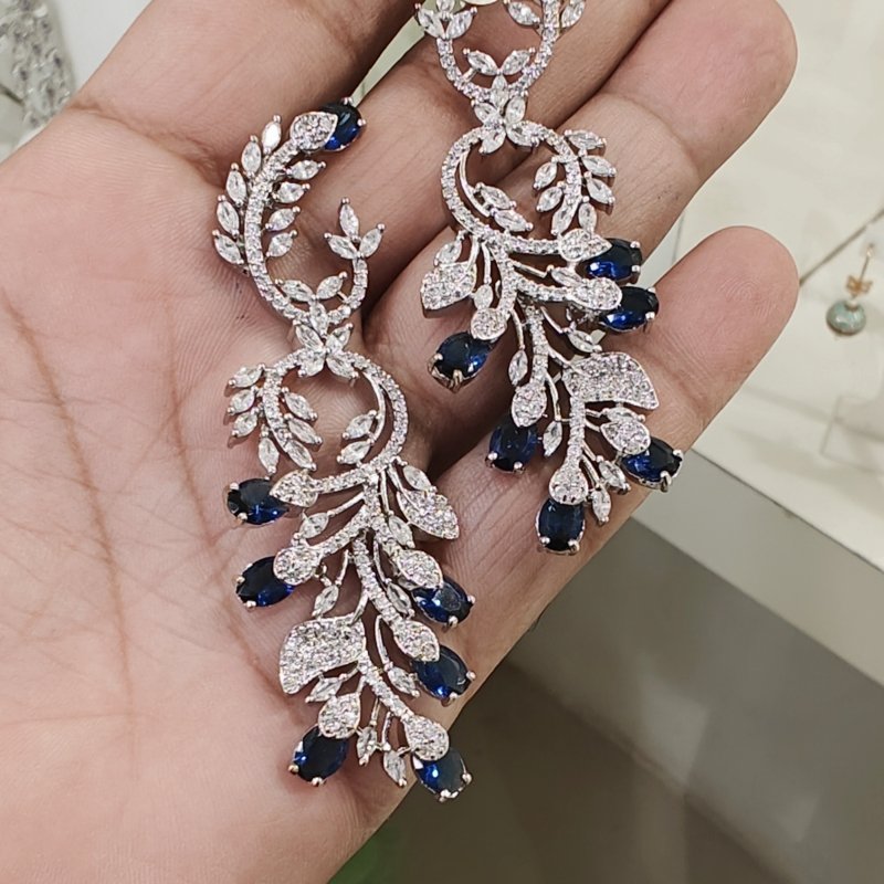 These designer earrings are studded with blue hydro stones surrounded by round and marquise shaped cz stones,plated in white rhodium polish .