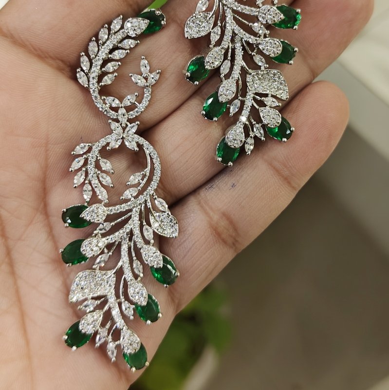 These designer earrings are studded with emerald green hydro stones surrounded by round and marquise shaped cz stones,plated in white rhodium polish .