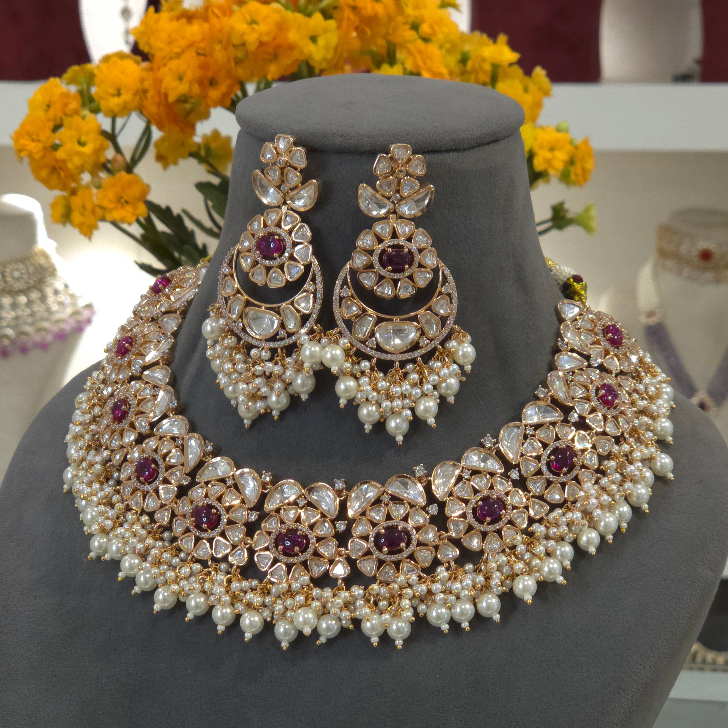 This Vaani polki neckline set is a stunning addition to any jewelry collection. Made with mixed metal alloy and plated in 14 kt gold, it exudes a shiny and lustrous look without being overly flashy. Adorned with cz silver foil polki, emerald green pota stones, and beaded with pearls, it adds an elegant touch to any outfit.