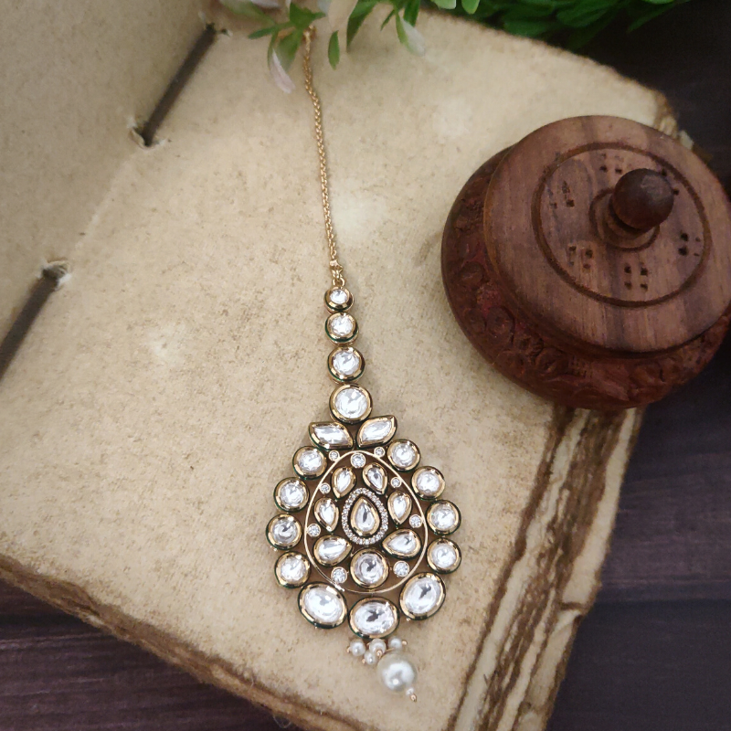 Crafted with kundan polki stones and pearls, this maangtikka is plated with 22-karat gold. The piece embodies exquisite beauty and sophistication that will undeniably captivate anyone's heart.