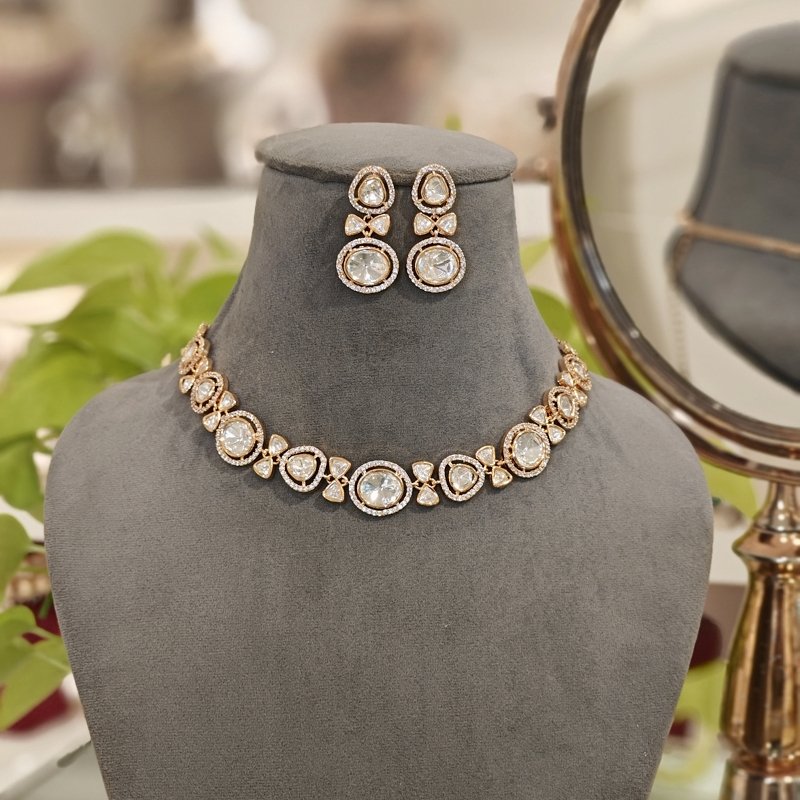 The vedhii necklace set is made with uncut artificial open polki surrounded with cz stones .