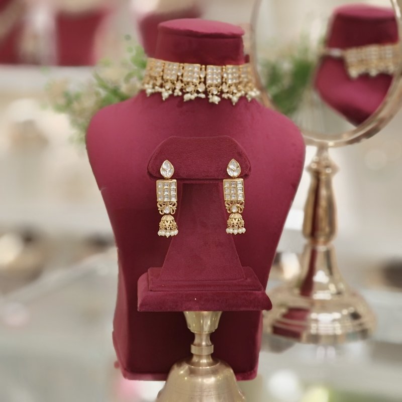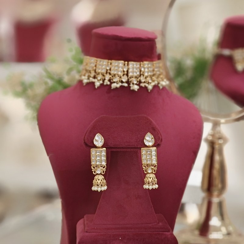 The Veena choker set is meticulously crafted using the finest uncut artificial polkis, which is then plated with a luxurious 22 kt gold colour to add more charm to it. To create this ornate piece of beauty even more special, the necklace is integrated with lovely small pearls that are arranged in a beaded fashion.