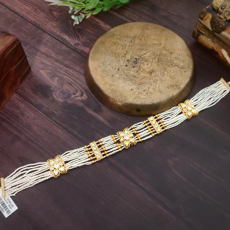 Artificial uncut polki sheeshpatti that is layered multiple times with micro pearls. To add to its rich appeal, it has been elegantly plated in 22 karat gold.