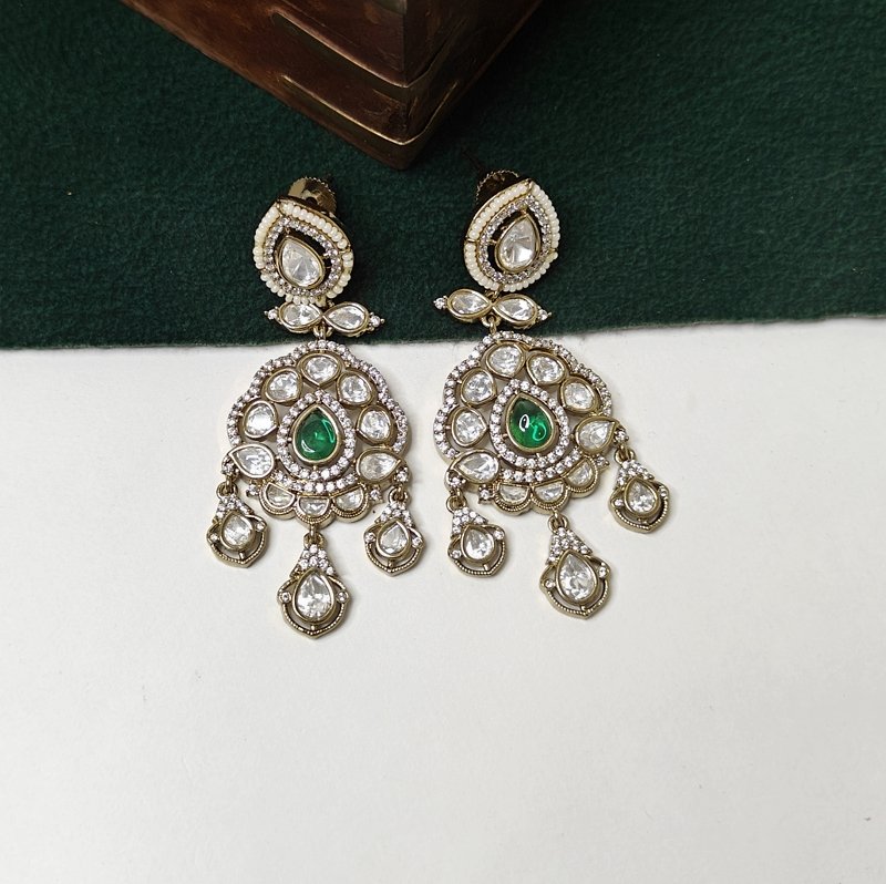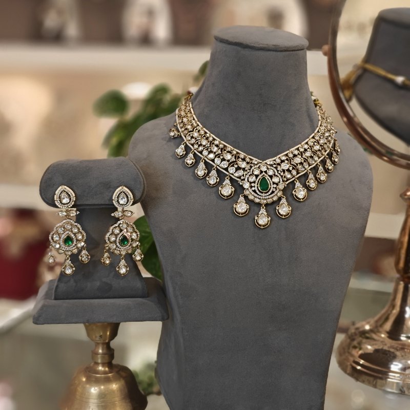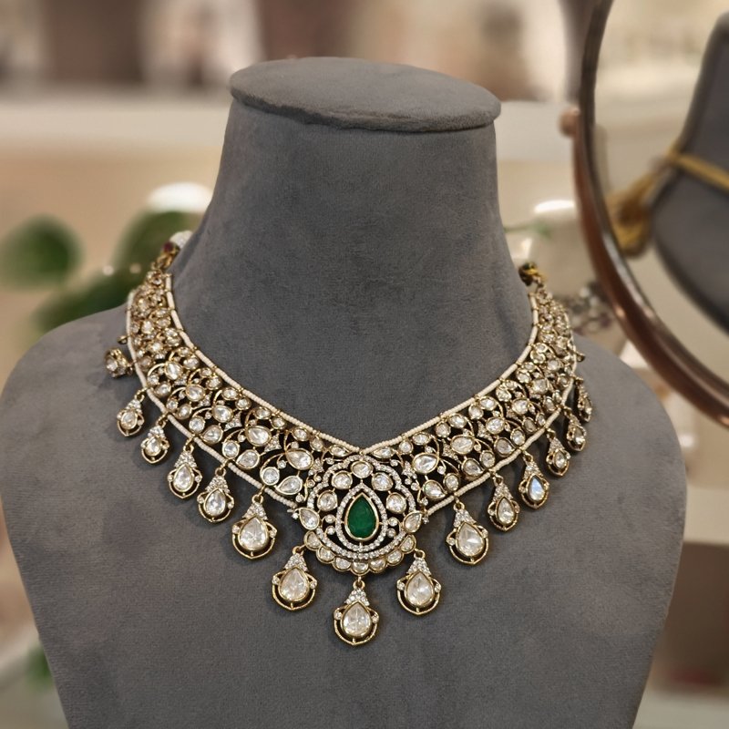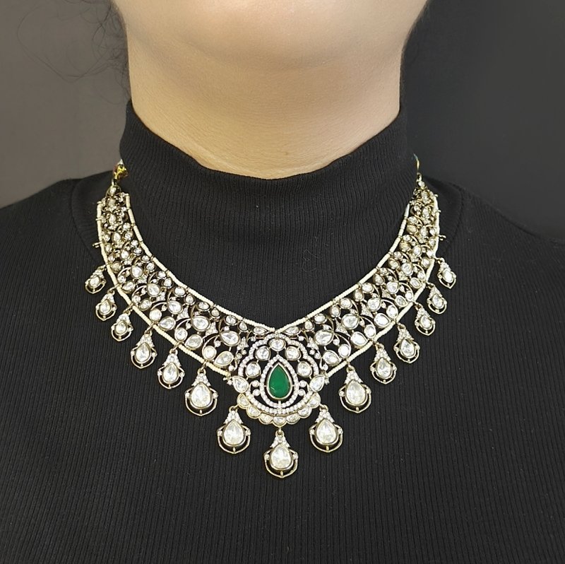 This exquisite semi bridal /bridal necklace set is a true masterpiece, studded with uncut CZ Polki stones with green faceted onax along with sparkling cubic zirconia. Plated with antique victorian plating , it exudes timeless elegance and luxury, making it the perfect choice for brides seeking a blend of traditional charm and contemporary brilliance.