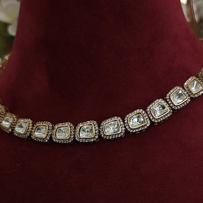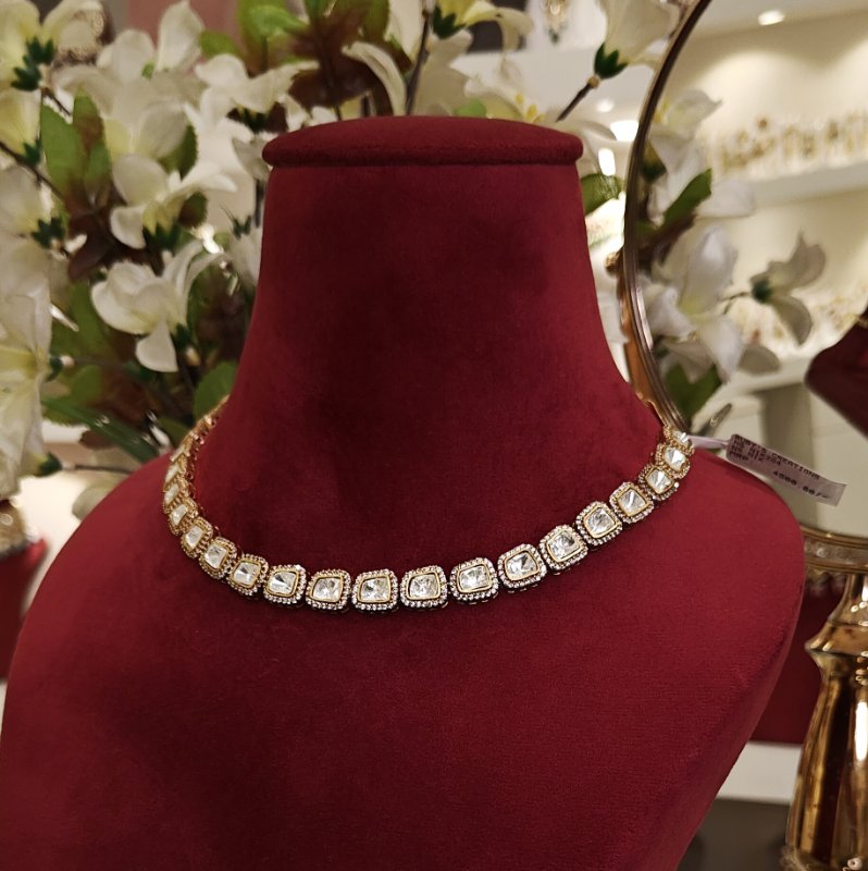 The veina single line polki neckline set is plated in matt gold colour plating and studded with zircon and polki stones accompanied with long earrings .