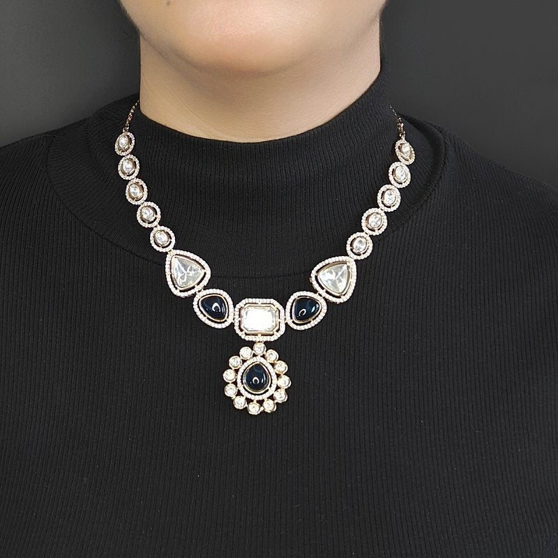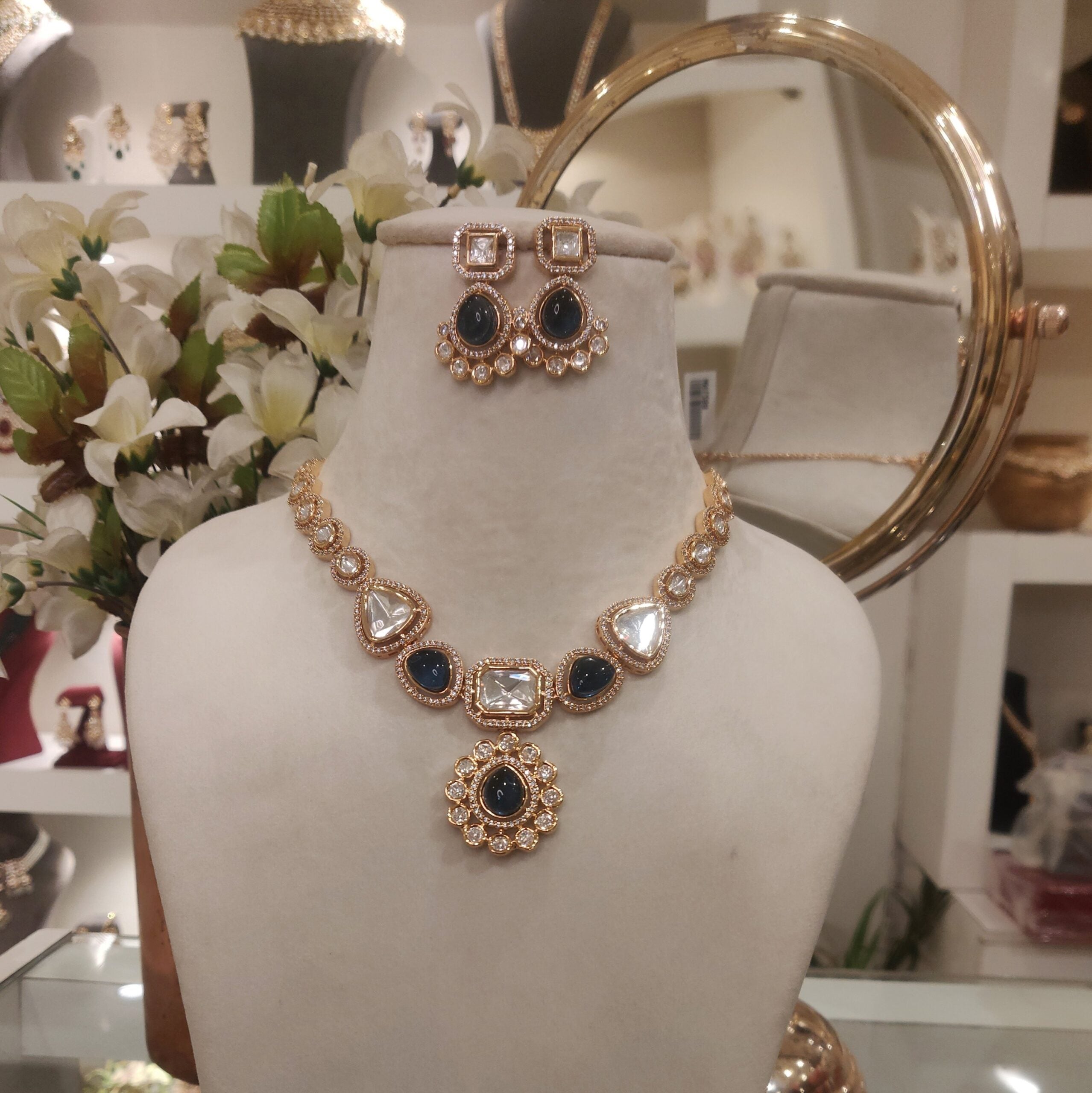 This necklace set, adorned with finest quality royal blue onax stone and clear artificial polki ,has been coated with 18 kt gold polish .