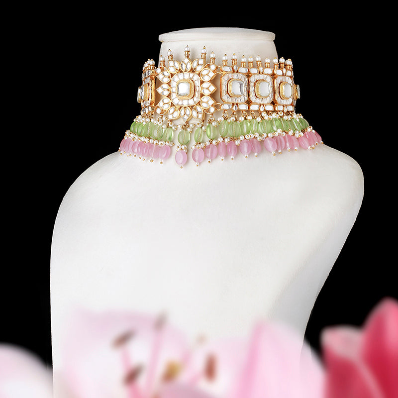 This exquisite piece of jewelry is a choker made of 22 kt gold plating and adorned with multi-colored paachi kundan work. The set includes gorgeous jhumkas and is beautifully beaded with stones in shades of mint green and pink. Be the envy of all when you don this stunning creation.