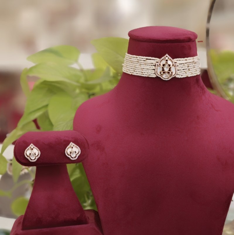 Anera choker is designed in classy mother of pearl layer crafted in perfect size surrounded by micro cz , plated in 14 kt gold colour .