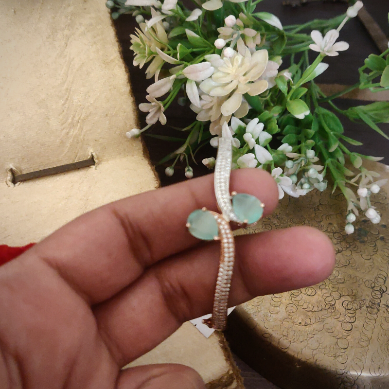 A bracelet with mint green pear shaped stones that has been plated with rose gold rhodium and set with cubic zirconia.