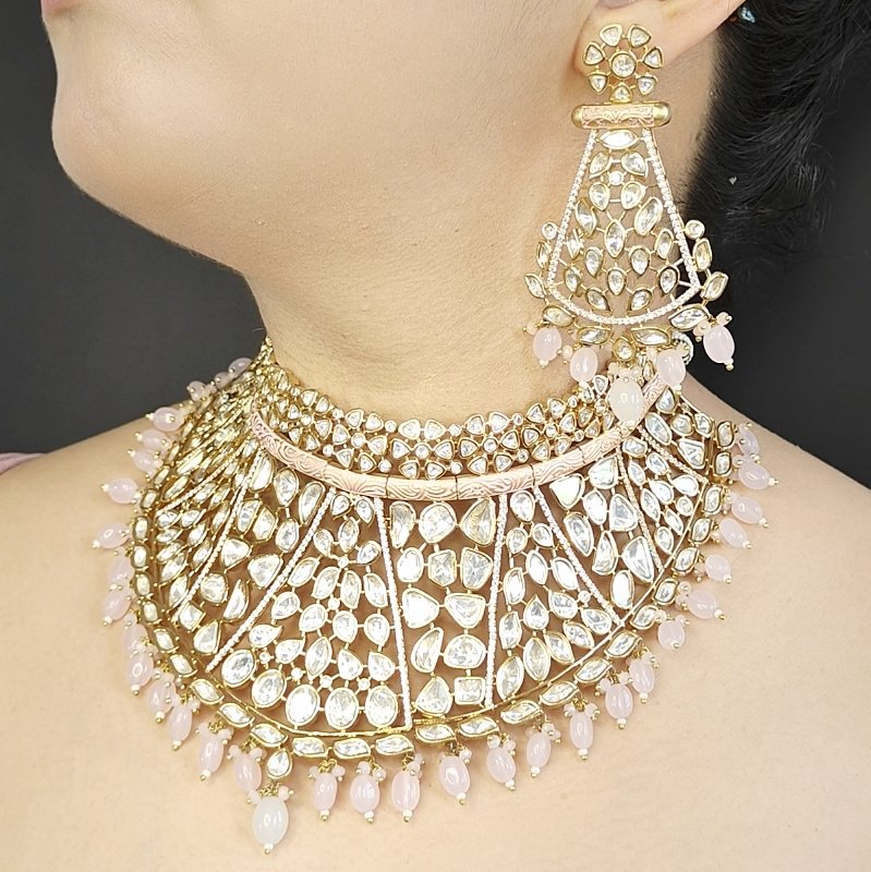 The yami choker set is meticulously crafted using the finest uncut artificial polki , which is then plated with a luxurious 18kt gold hue to add more charm to it. To create this ornate piece of beauty even more special, the necklace is integrated with pearls and baby pink monalaisa beads that are arranged in a beaded fashion. This necklace can be customized in any colour of your choice .