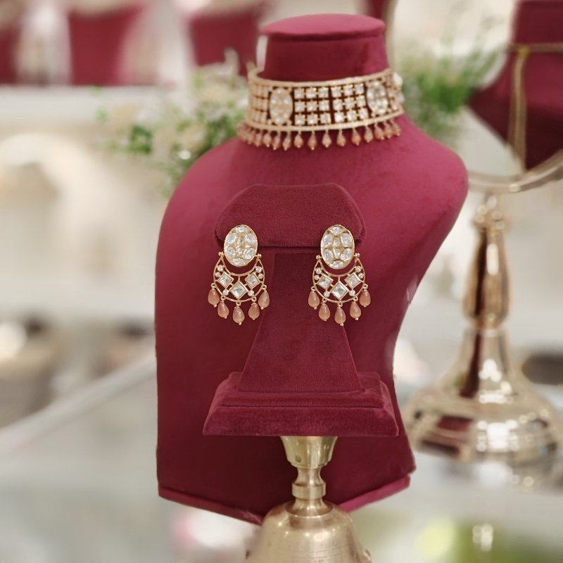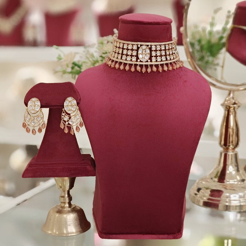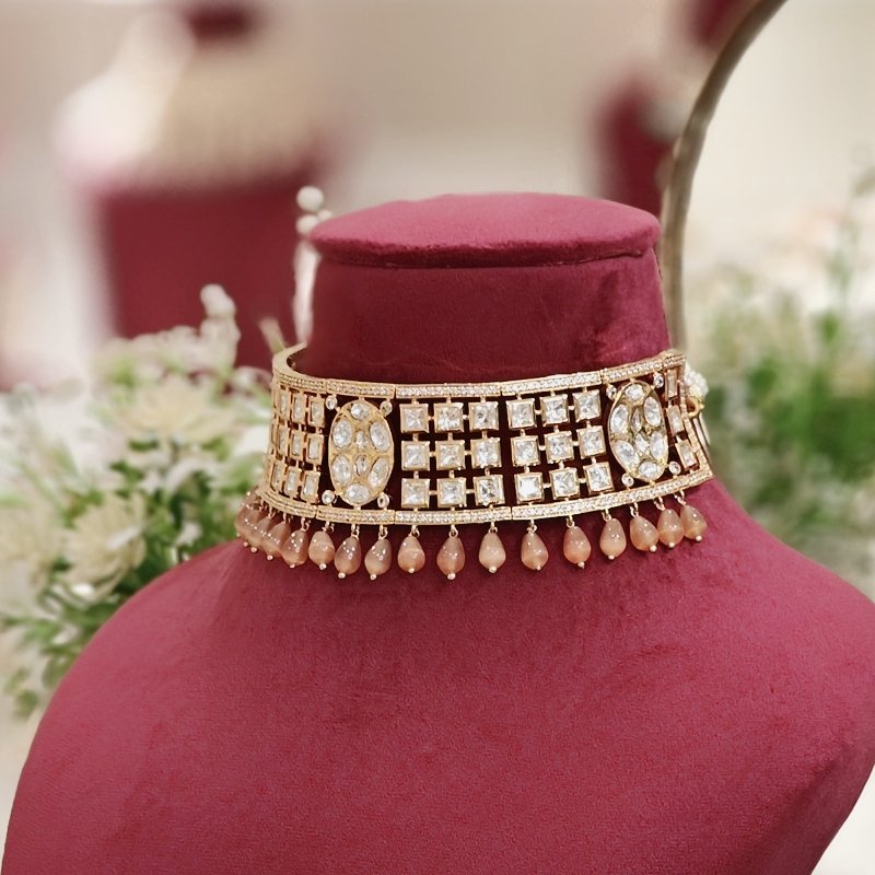 This captivating choker is fabricated in artificial polkies and embellished with green bead drops, exuding a luxurious feel with its 18 karat gold plating.