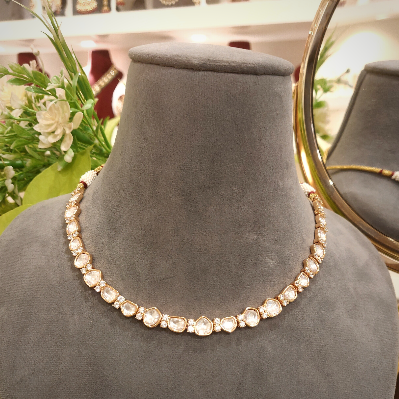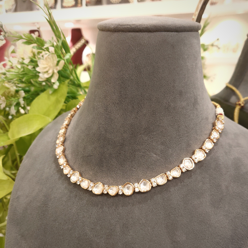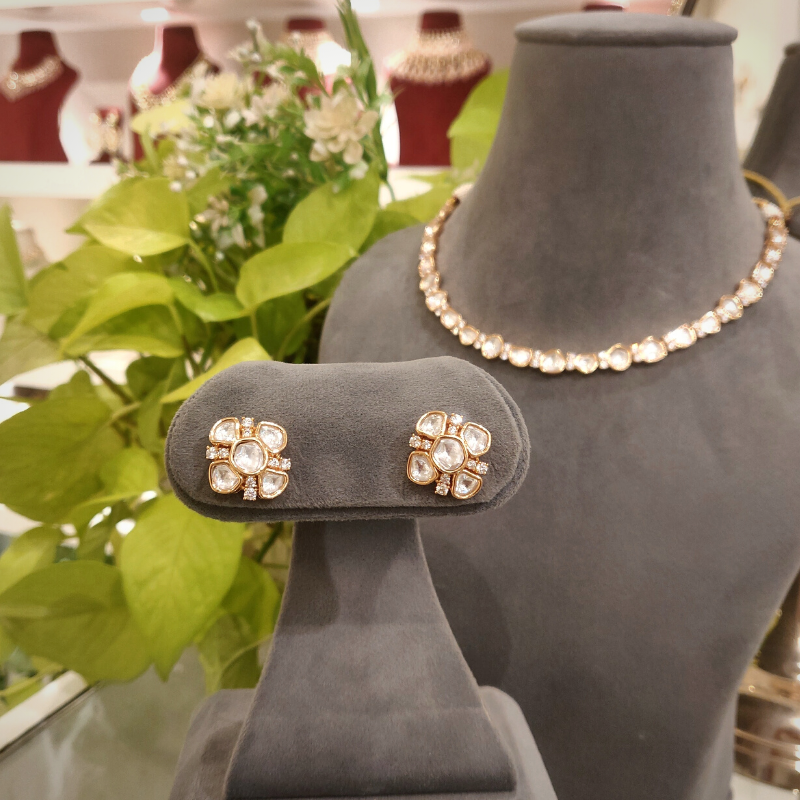 The Zaibaa single line polki neckline set is plated in rose gold colour and studded with zircon and polki stones accompanied with studs .