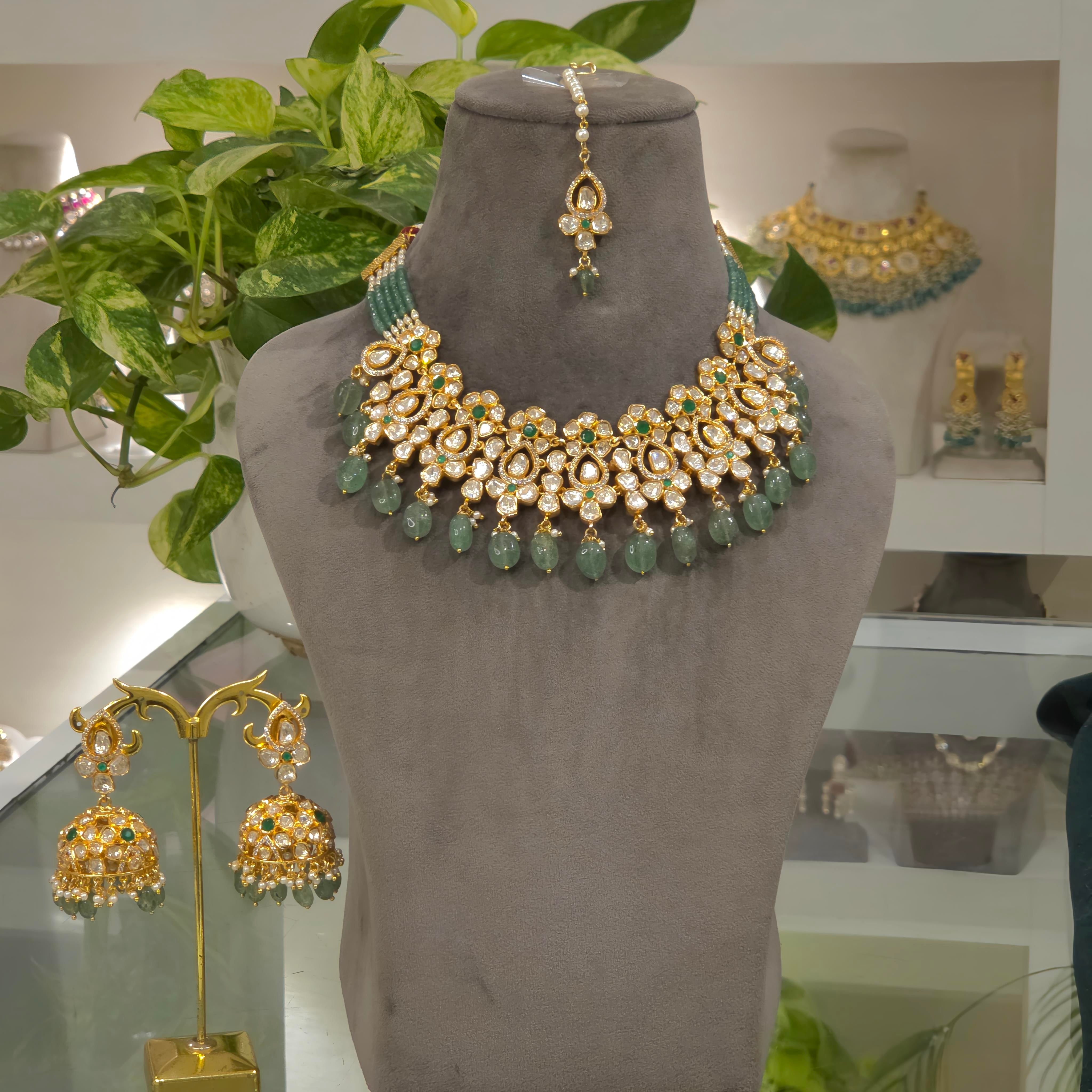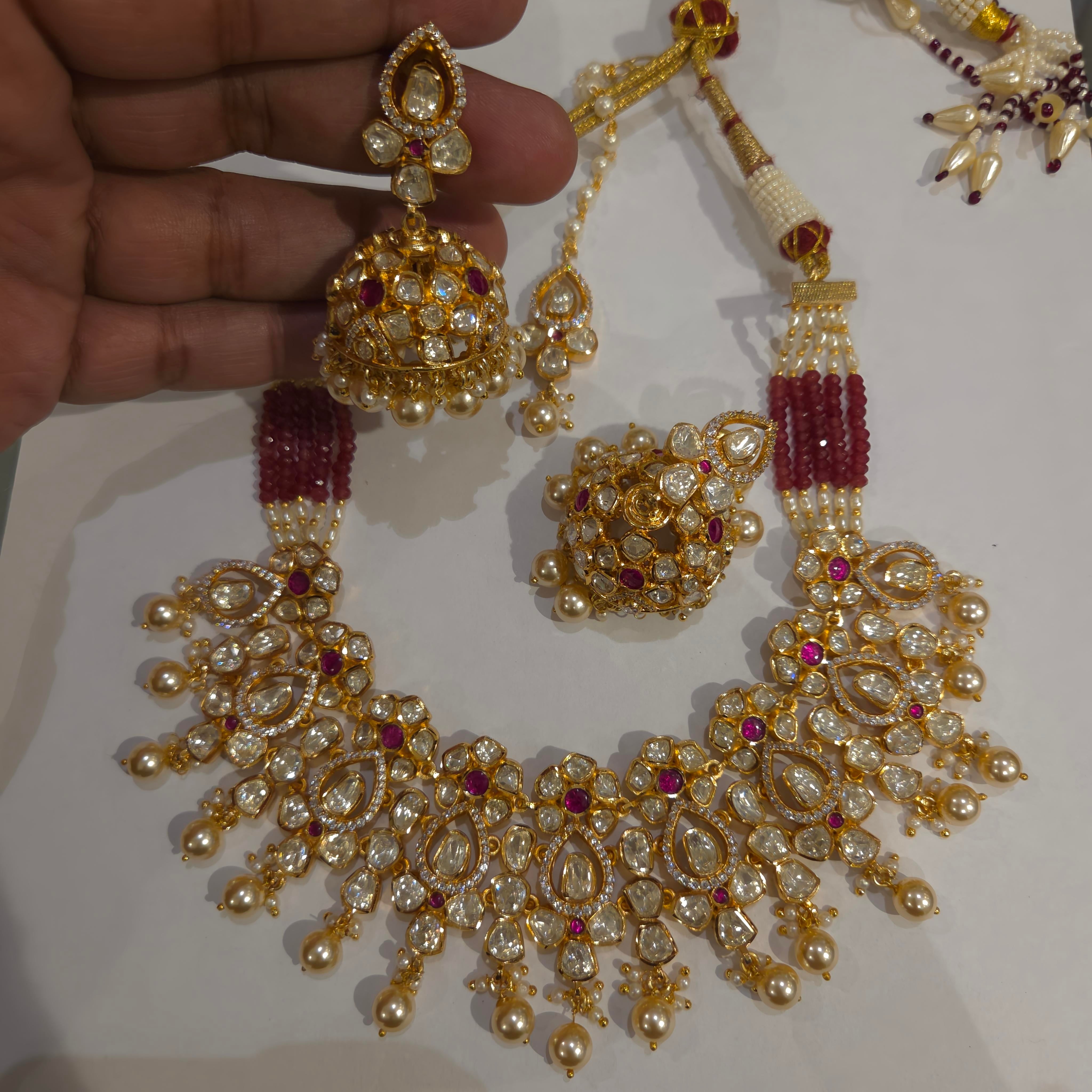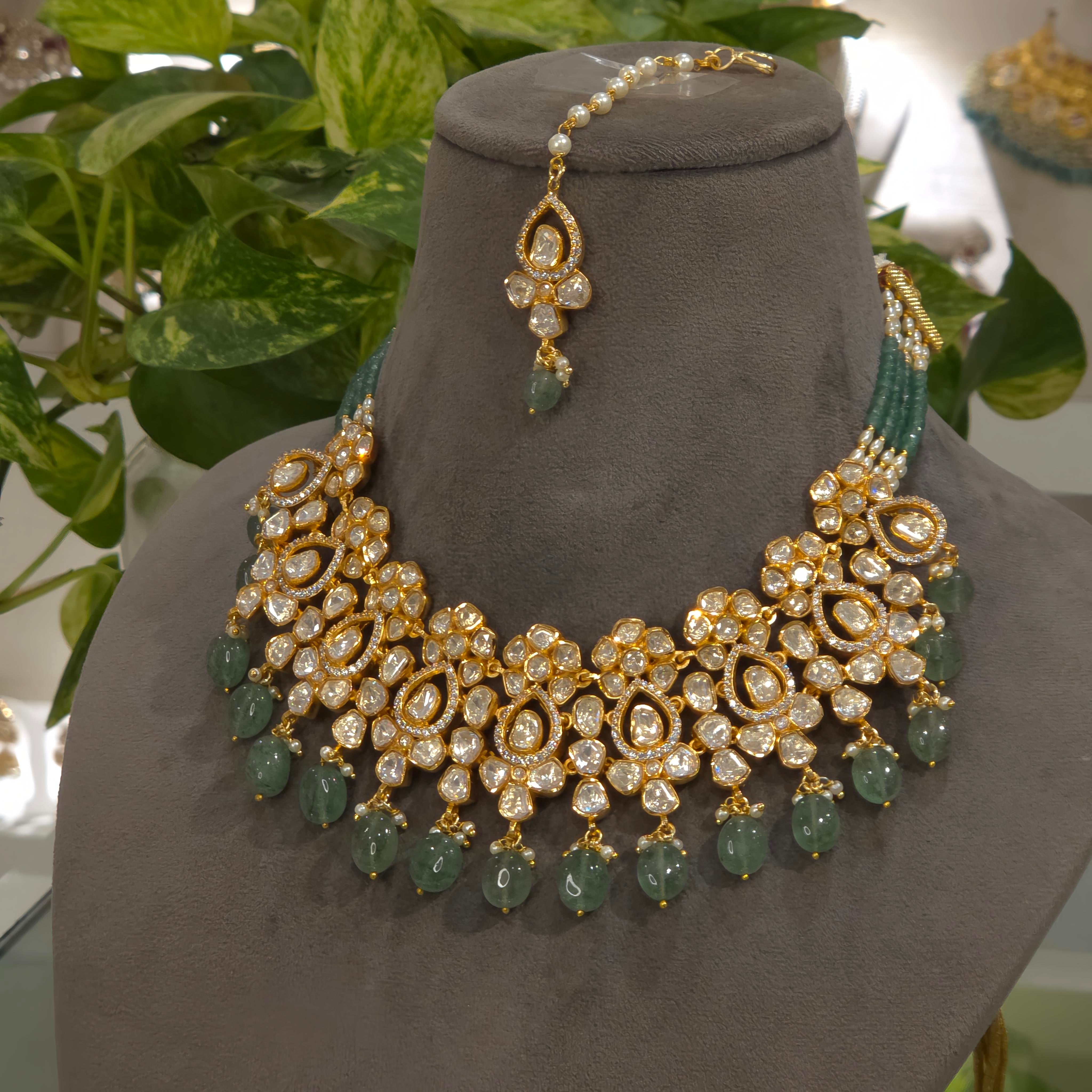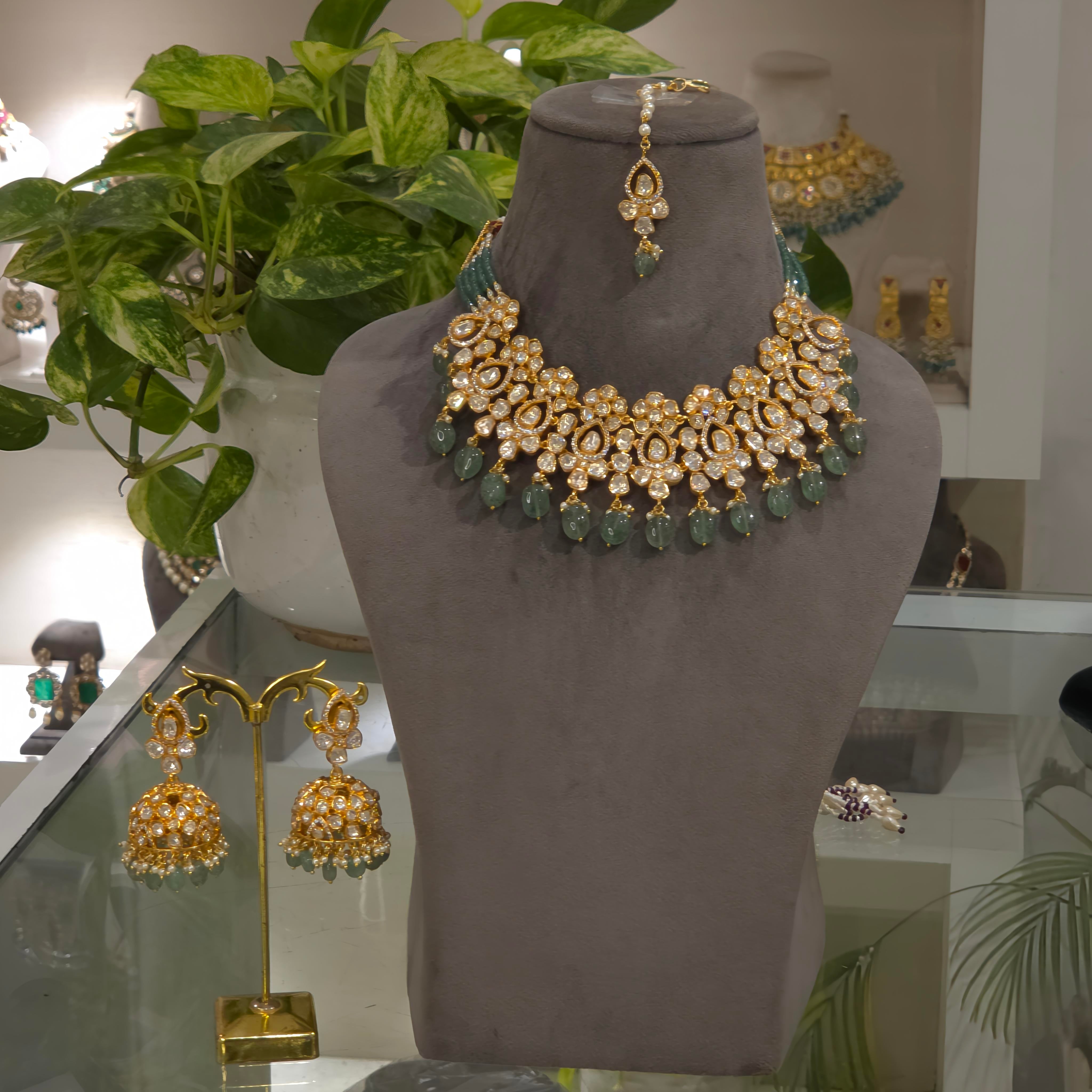 Expertly crafted with the highest quality LB shade moissanite polki gems, this set features a stunning neckline design with elegant jhumka and tikka embellishments. Made with a 22 kt gold plated mixed metal alloy, it exudes both luxury and sophistication.