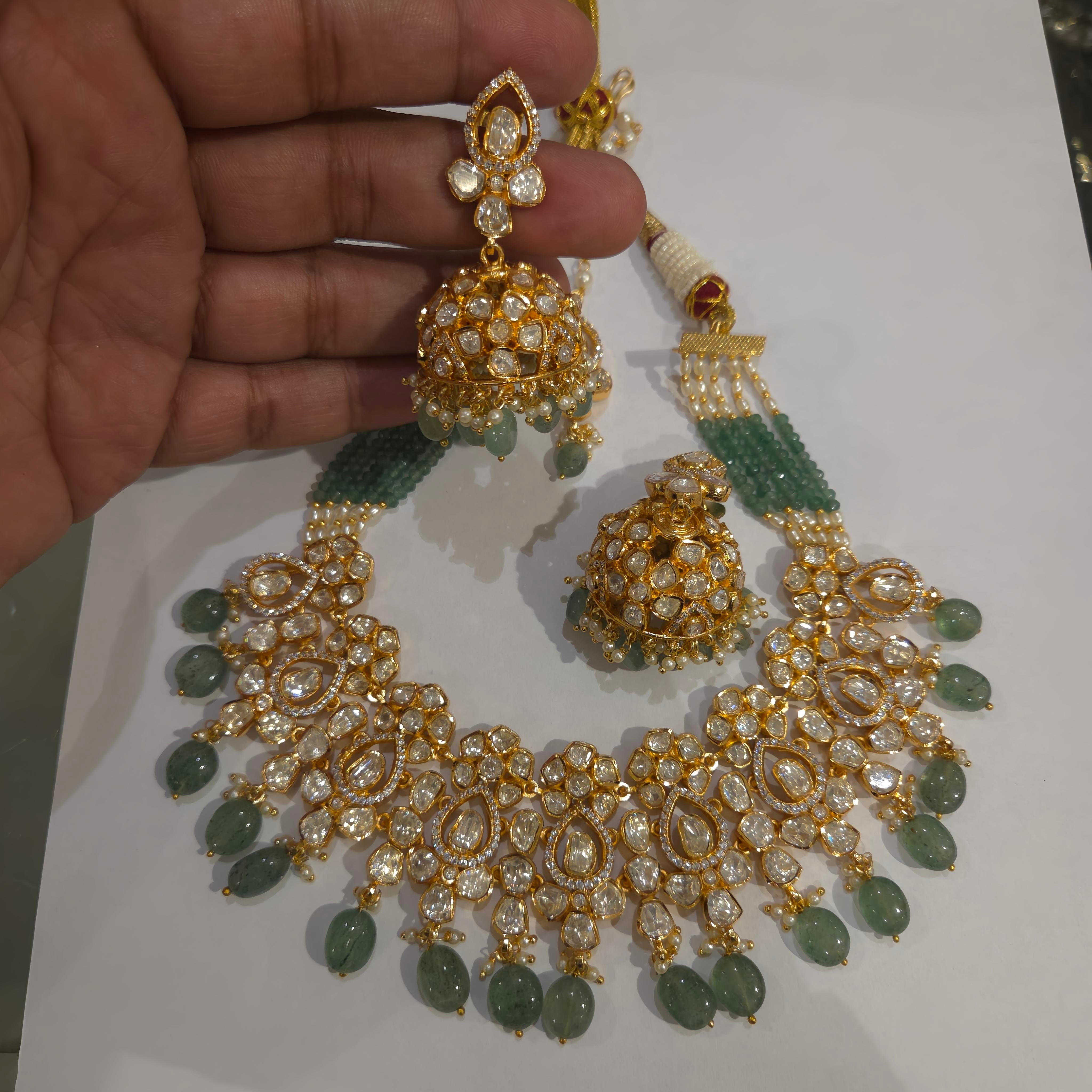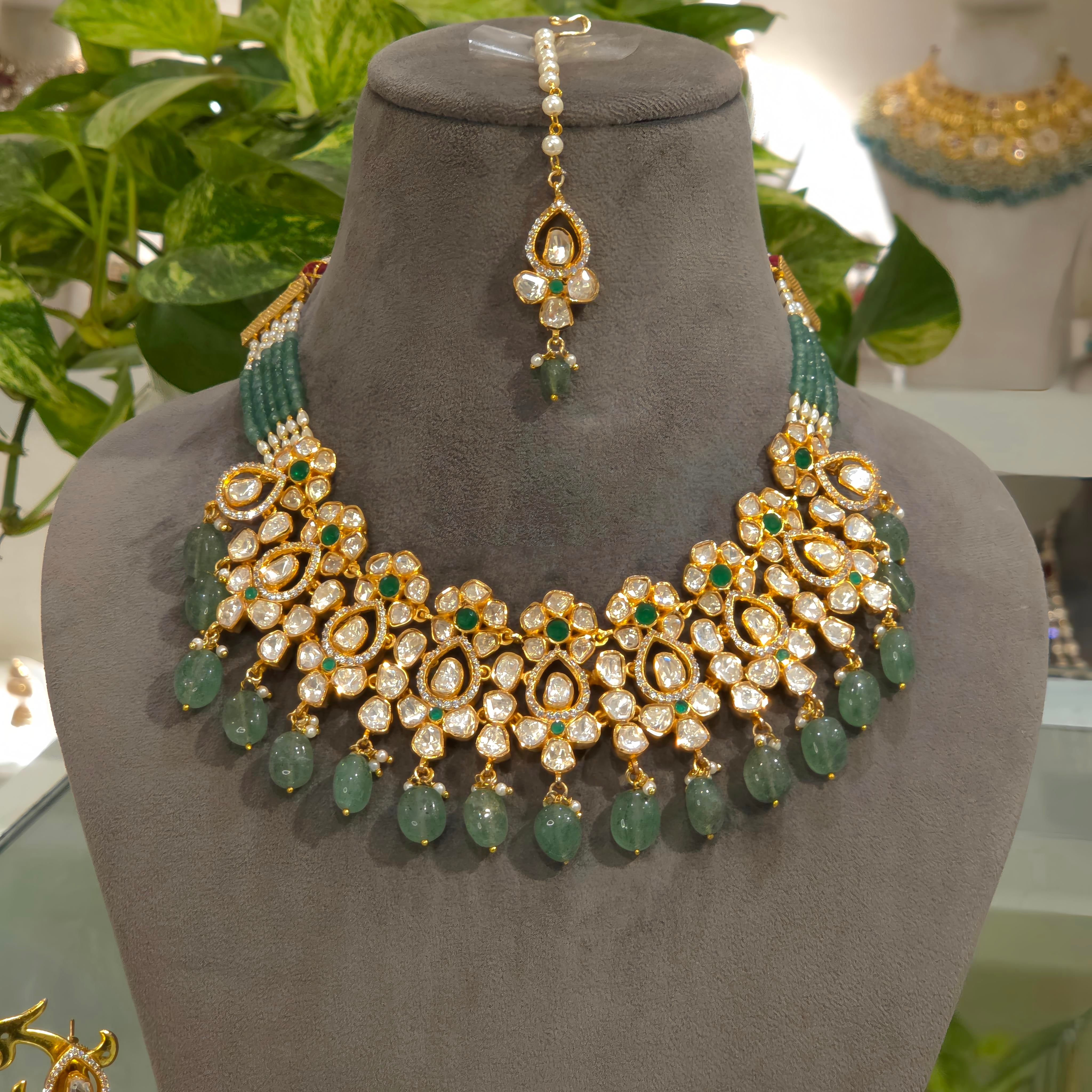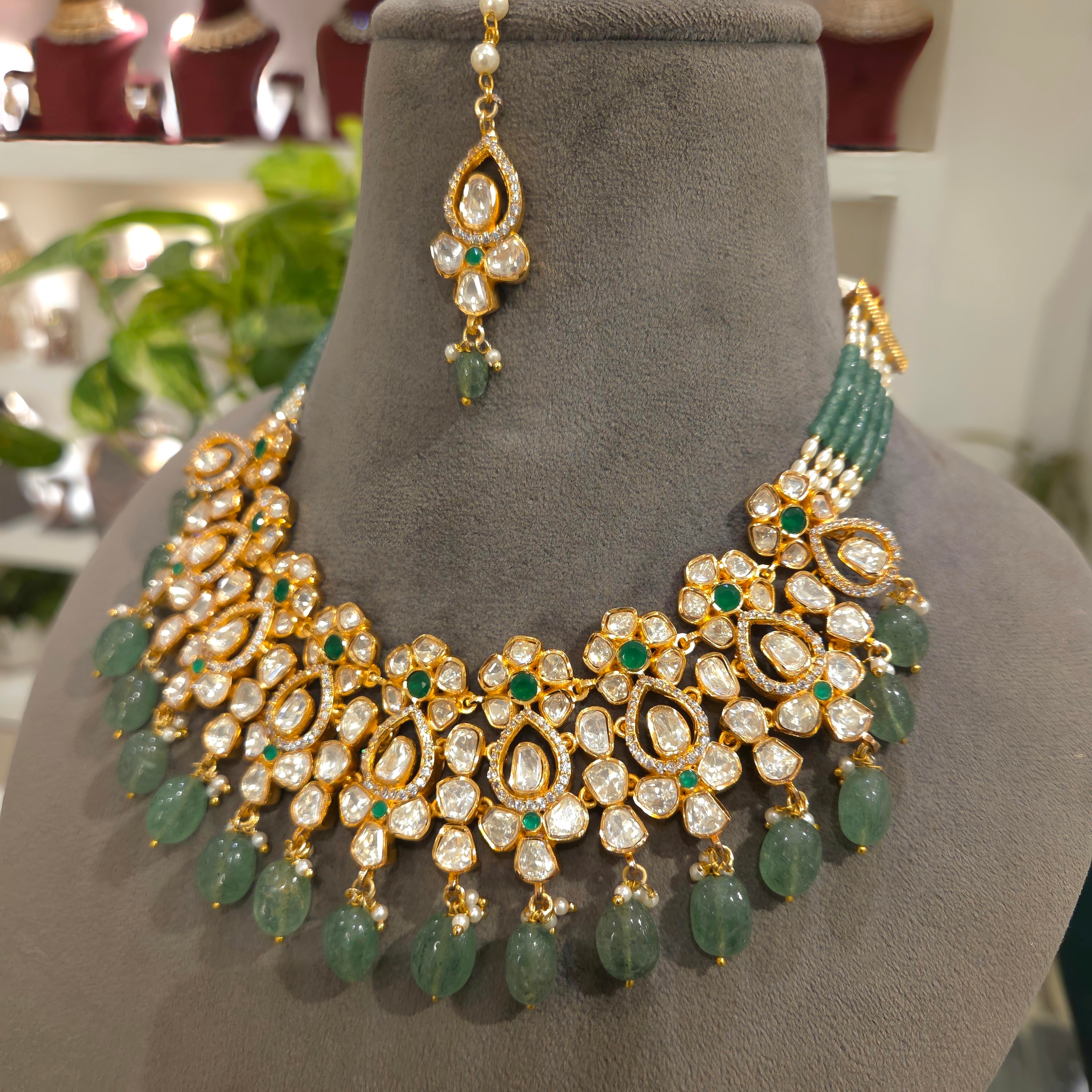 Expertly crafted with the highest quality LB shade moissanite polki gems, this set features a stunning neckline design with elegant jhumka and tikka embellishments. Made with a 22 kt gold plated mixed metal alloy, it exudes both luxury and sophistication.