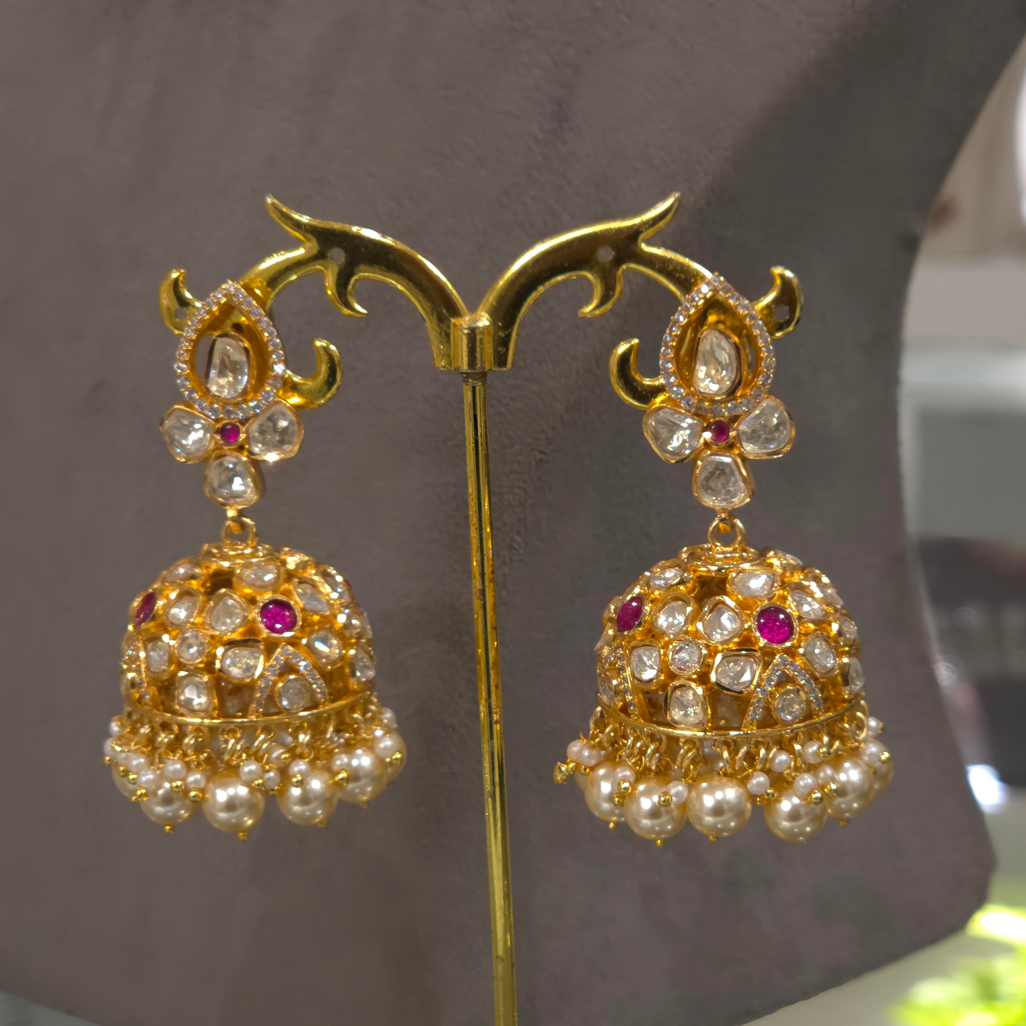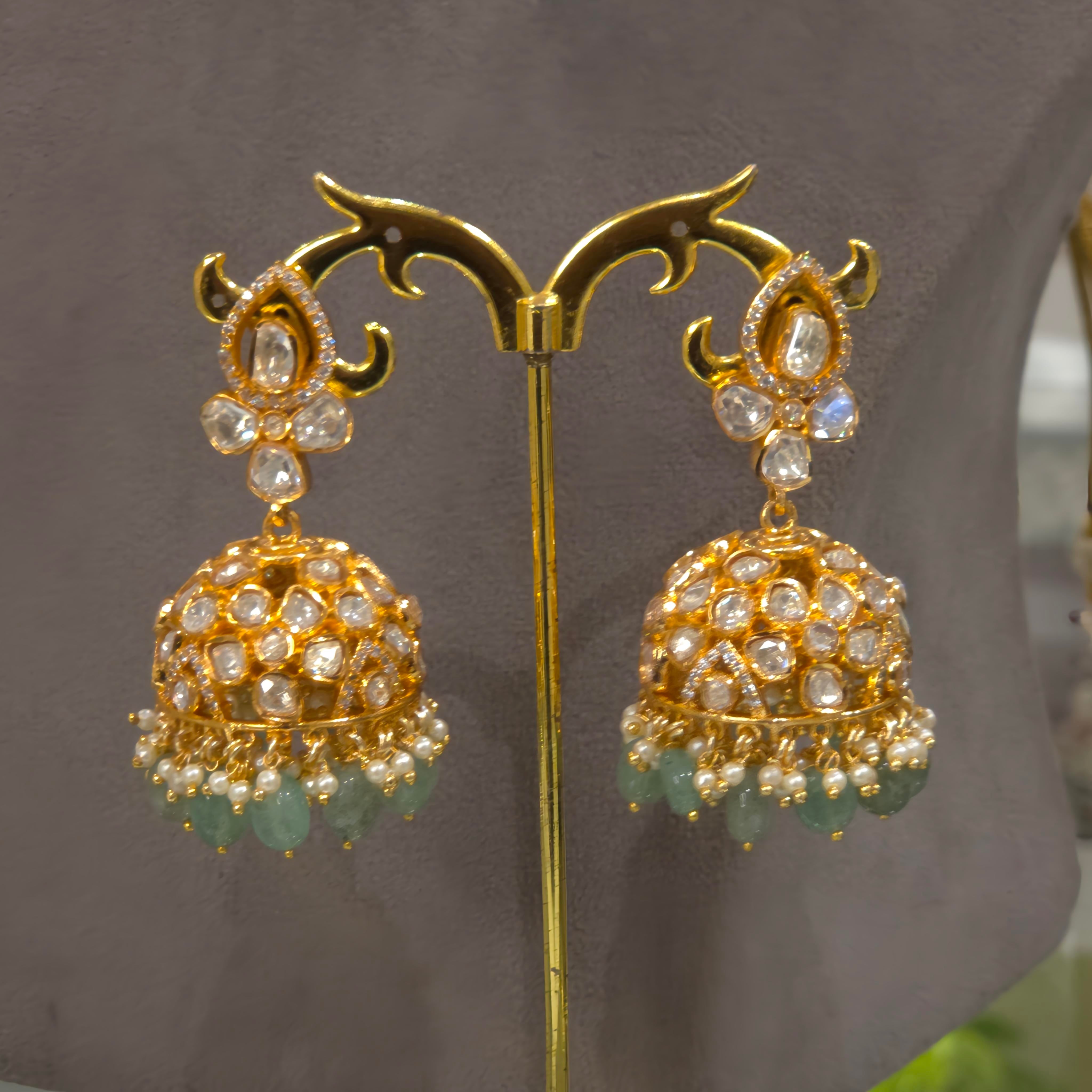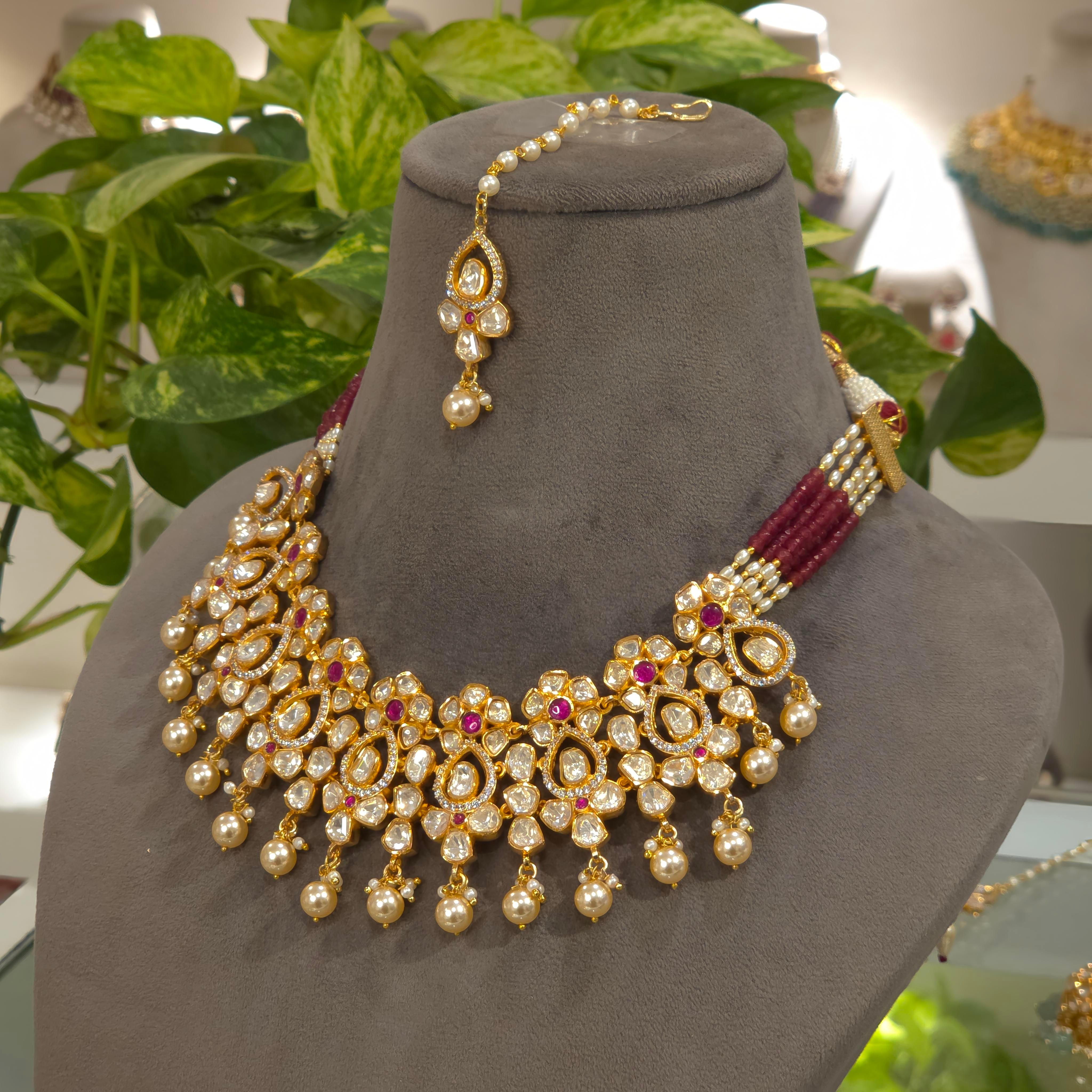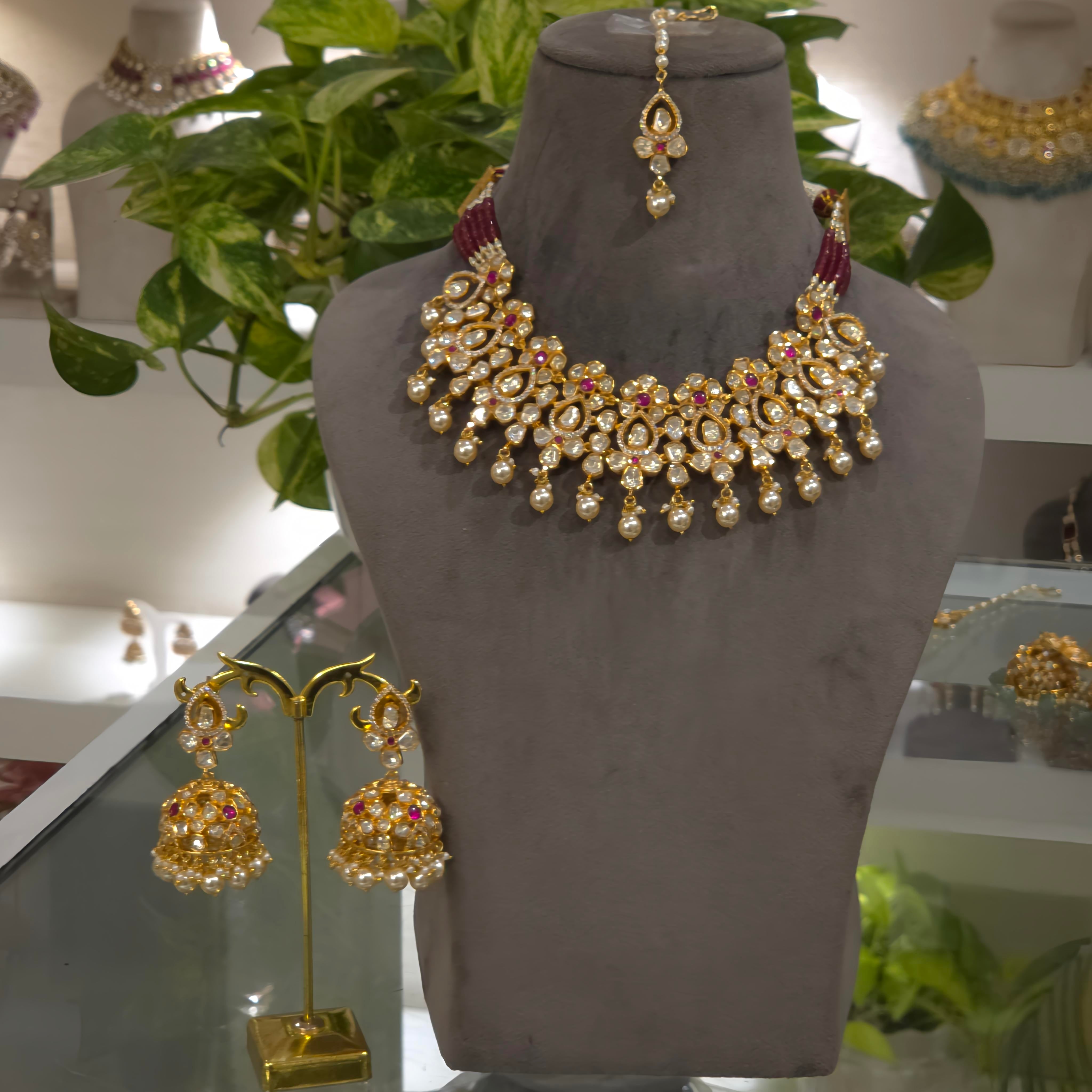 Expertly crafted with the highest quality LB shade moissanite polki gems, this set features a stunning neckline design with elegant jhumka and tikka embellishments. Made with a 22 kt gold plated mixed metal alloy, it exudes both luxury and sophistication.