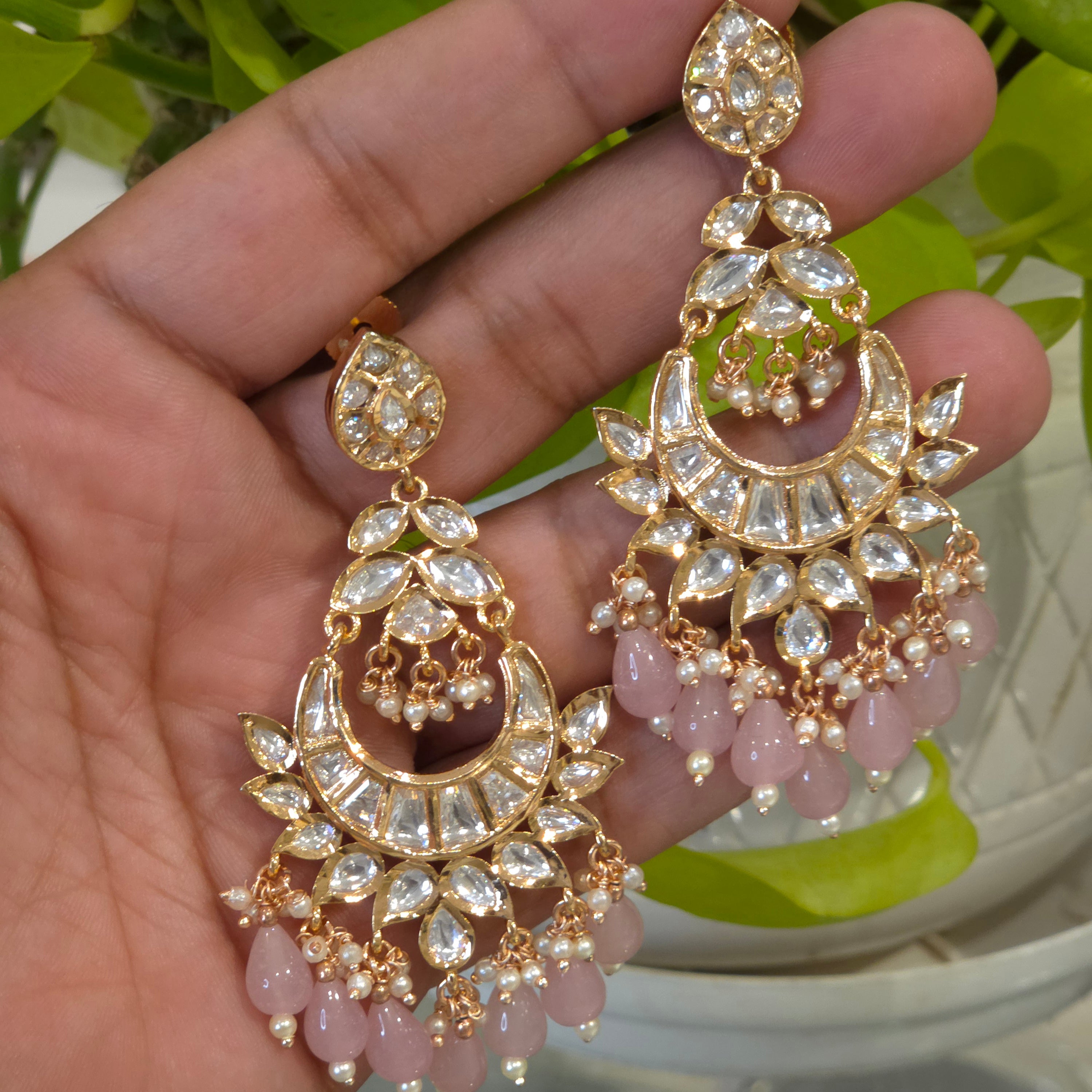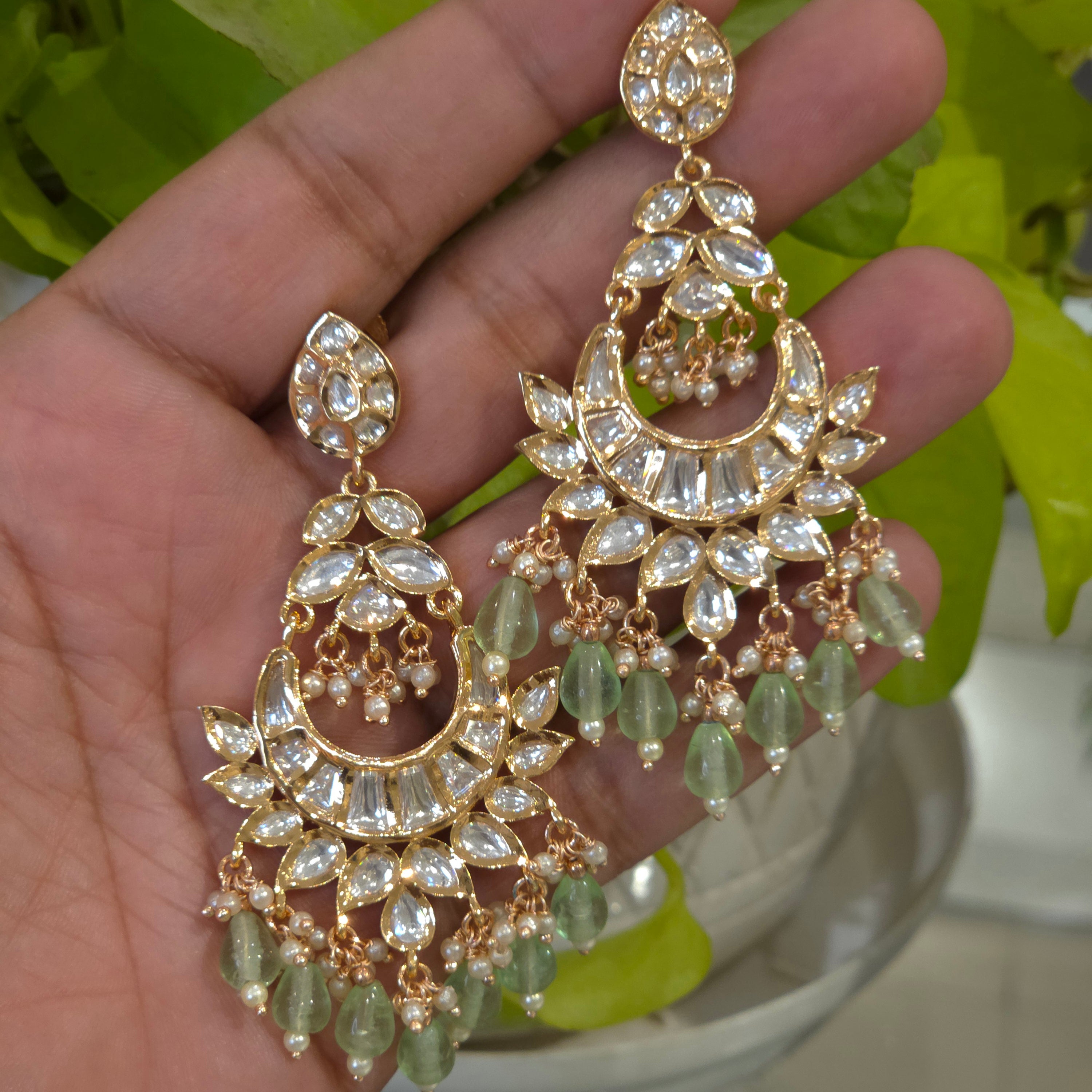 The Zeeba polki earrings feature a chandelier design, constructed from CZ silver foil polki and set in a durable 14 kt gold-plated mixed metal alloy. This combination ensures both aesthetic appeal and structural integrity, offering a sophisticated accessory that complements various styles and occasions.
