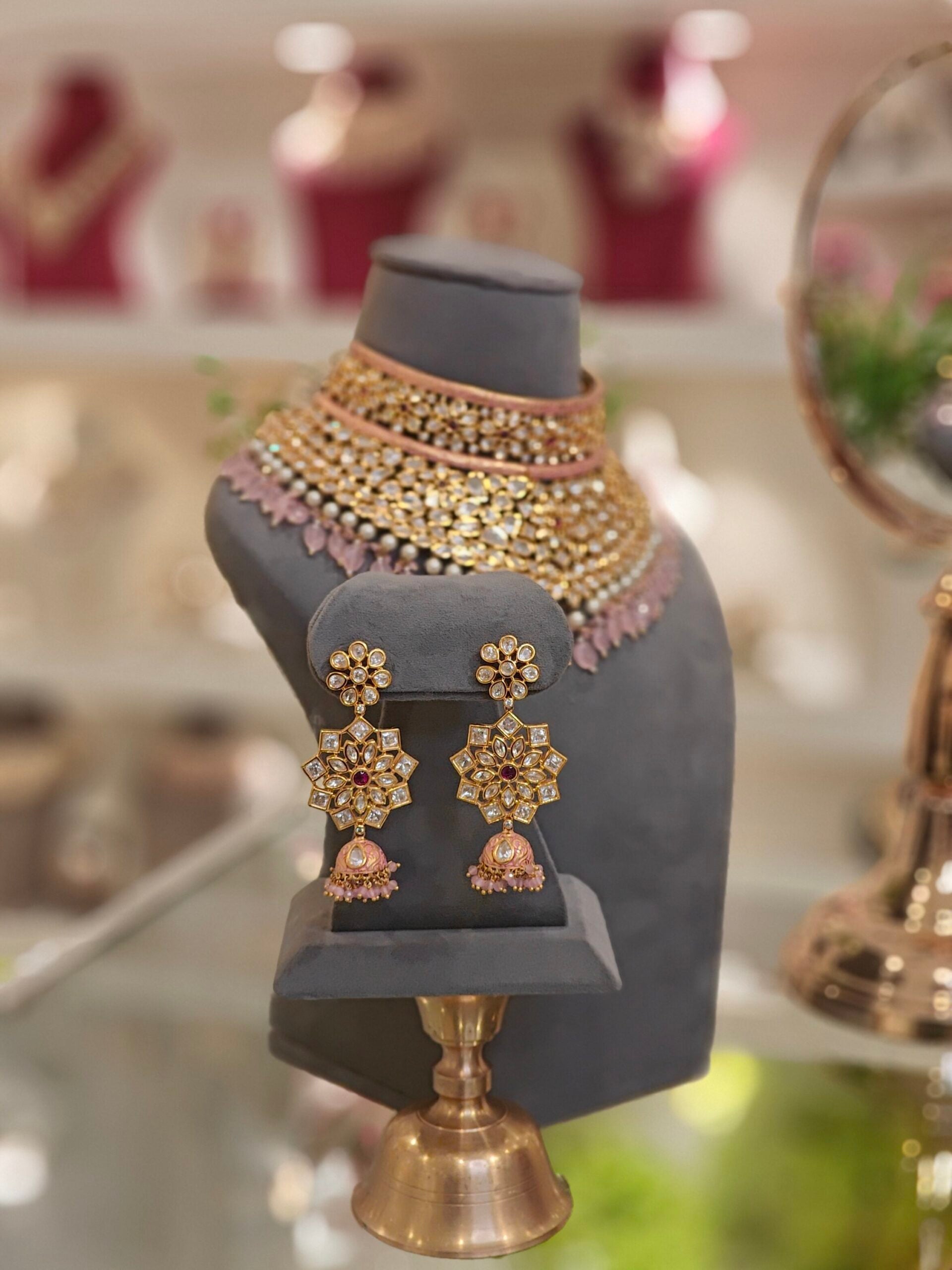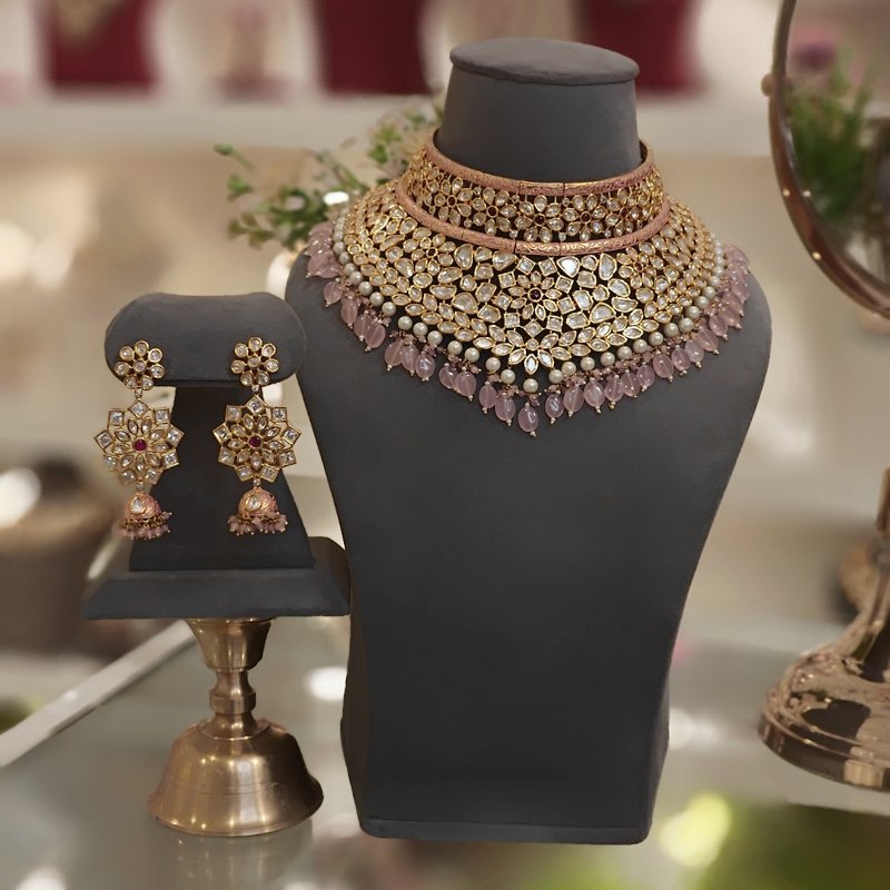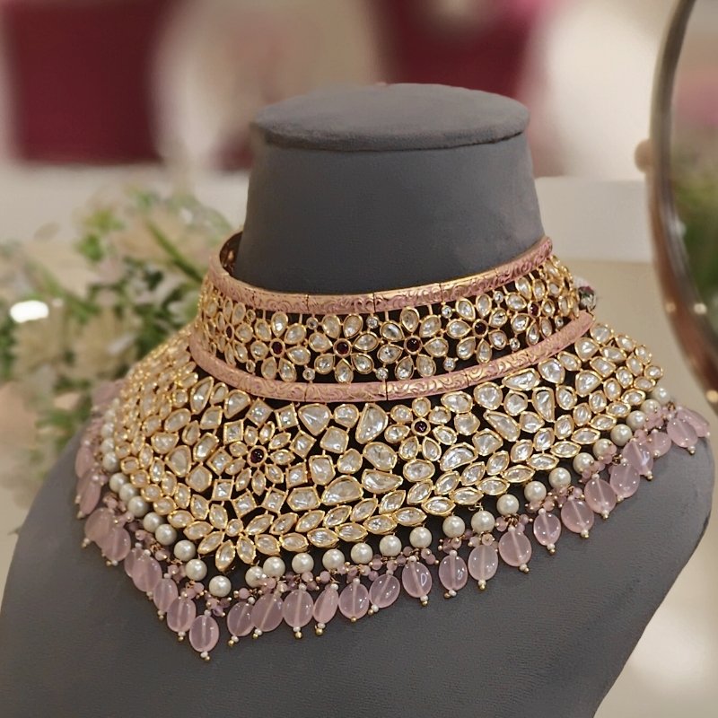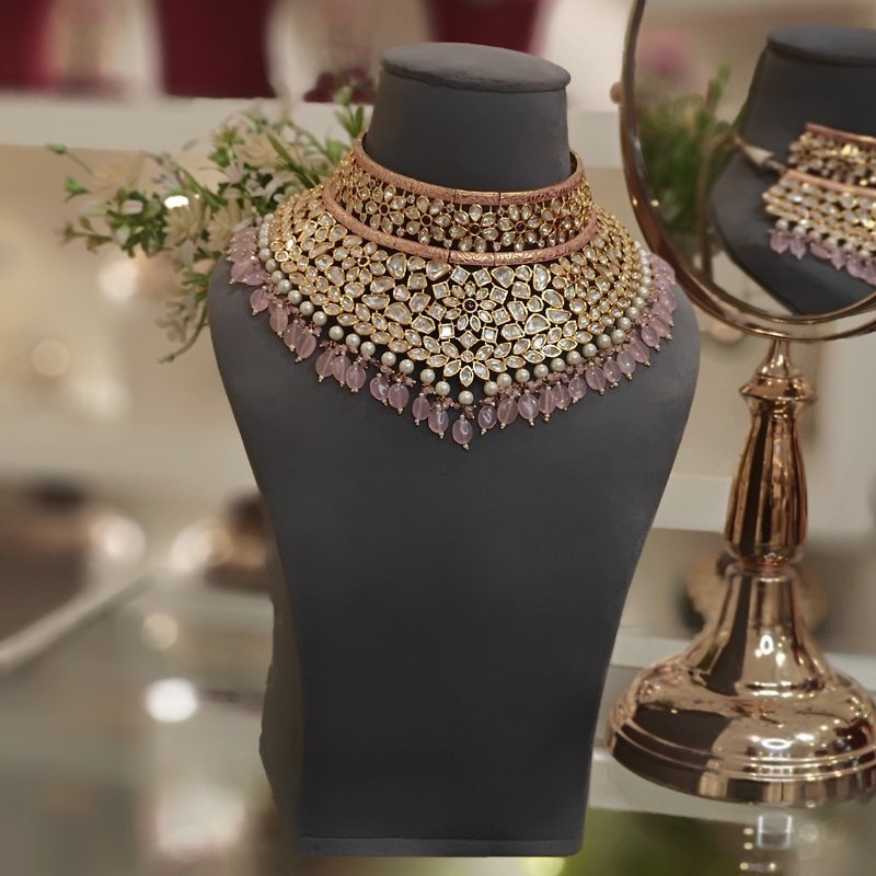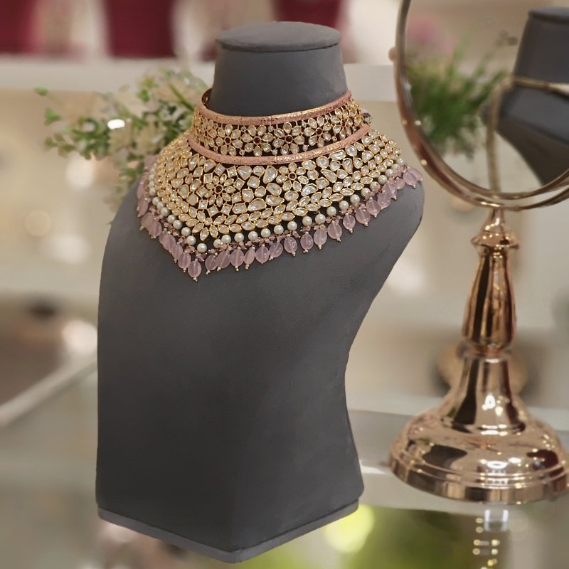 The Zia choker set is meticulously crafted using the finest uncut artificial polki and gorgeous Pink enamel facades, which is then plated with a luxurious 14kt gold hue to add more charm to it. To create this ornate piece of beauty even more special, the necklace is integrated with baby pink monalisa that are arranged in a beaded fashion. This necklace can be customized in any colour of your choice .